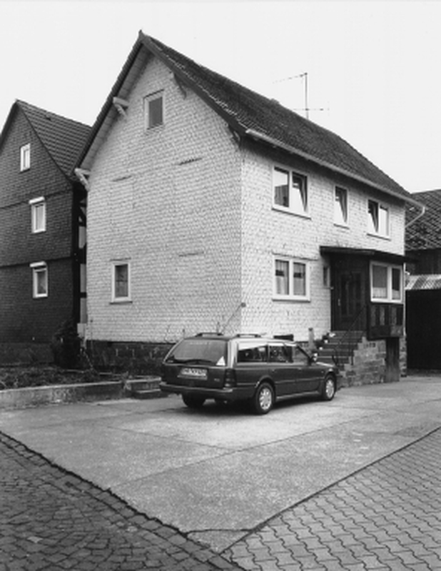 Wohnhaus als Teil der im Sichtbereich der Kirche angesiedelten Bebauung, komplett mit handgemachten Holzschindeln behangener Fachwerkbau auf hohem, teilweise in Werkstein errichtetem Sockel, der als Stall genutzt wurde, darüber ist eine Rähmkonstruktion mit konvergierenden Streben zu erwarten. Das Dach mit verzierten Kopfbändern zur Abstützung der Pfetten, als Deckung diagonal verlegte Betonplatten. Der durch große Fenstereinbauten gestörte Bau ist in das letzte Drittel des 19. Jhs. zu datieren.