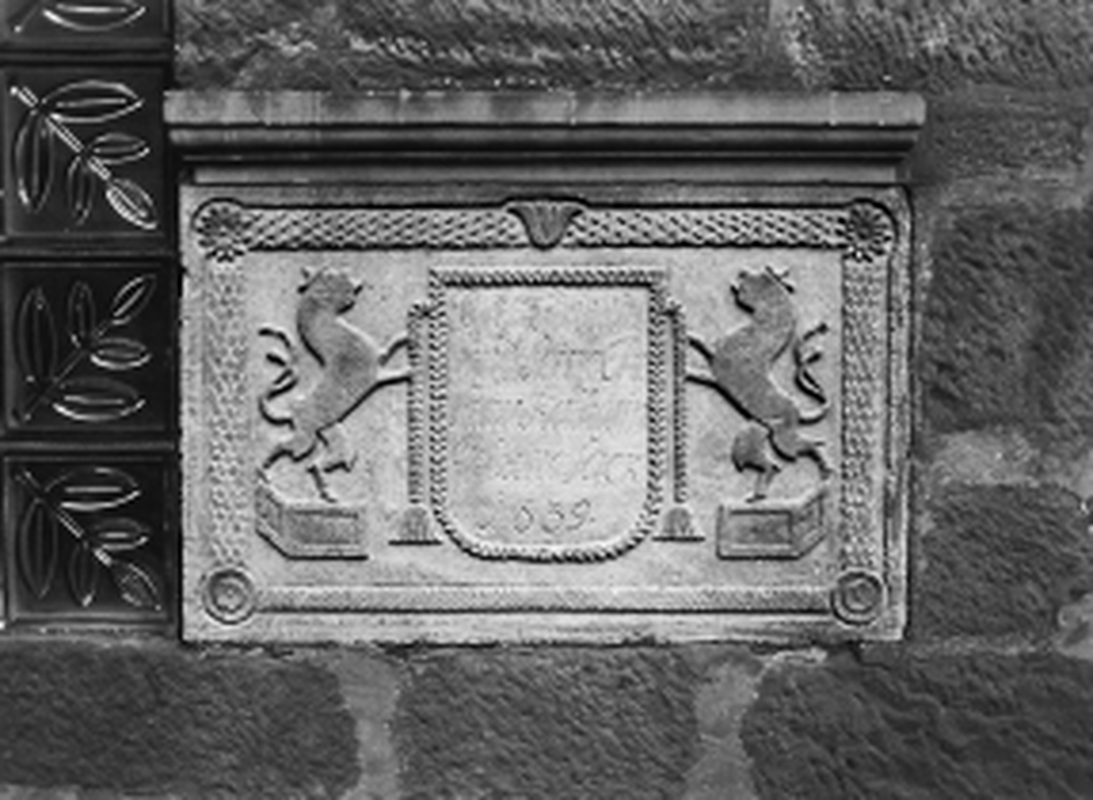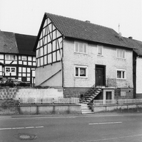 Traufständiges Wohnhaus auf hohem Sandsteinsockel, hier war der Stall untergebracht, im Sockelmauerwerk ein reich profilierter Inschriftstein mit Wappen und Löwendarstellung: "Peter Schmitt und seine Ehefrau Katharin geborene Sack 1839", unter dem Schindelbehang konstruktives Fachwerk mit konvergierenden Streben. Ortsgeschichtliche Bedeutung als Wohnhaus des P. Schmitt, der als Baumeister der Momberger Kirche überliefert ist. Zum Haus gehört eine rückwärtig in der Bogenweg angesiedelte Scheune der zweiten Hälfte des 19. Jhs., die noch mit historischen S-Ziegeln gedeckt ist und städtebauliche Bedeutung besitzt als Teil der geschlossenen Bebauung in diesem Ortskernbereich.