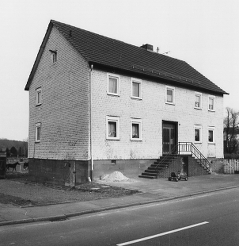 Traufständiges Wohnhaus auf hohem, ehemals stallgenutztem Sockelgeschoß, das über eine repräsentative zweiläufige Freitreppe erschlossen wird. Die Fassade ist durch handgemachte Holzschindeln verkleidet, darunter wird ein klar fünfachsig gegliedertes konstruktives Fachwerk des späten 19. Jhs. zum Vorschein kommen. Der Bau ist in seiner Stellung als letztes Haus der Hauptstraße im Ortsbild auch von städtebaulicher Bedeutung.