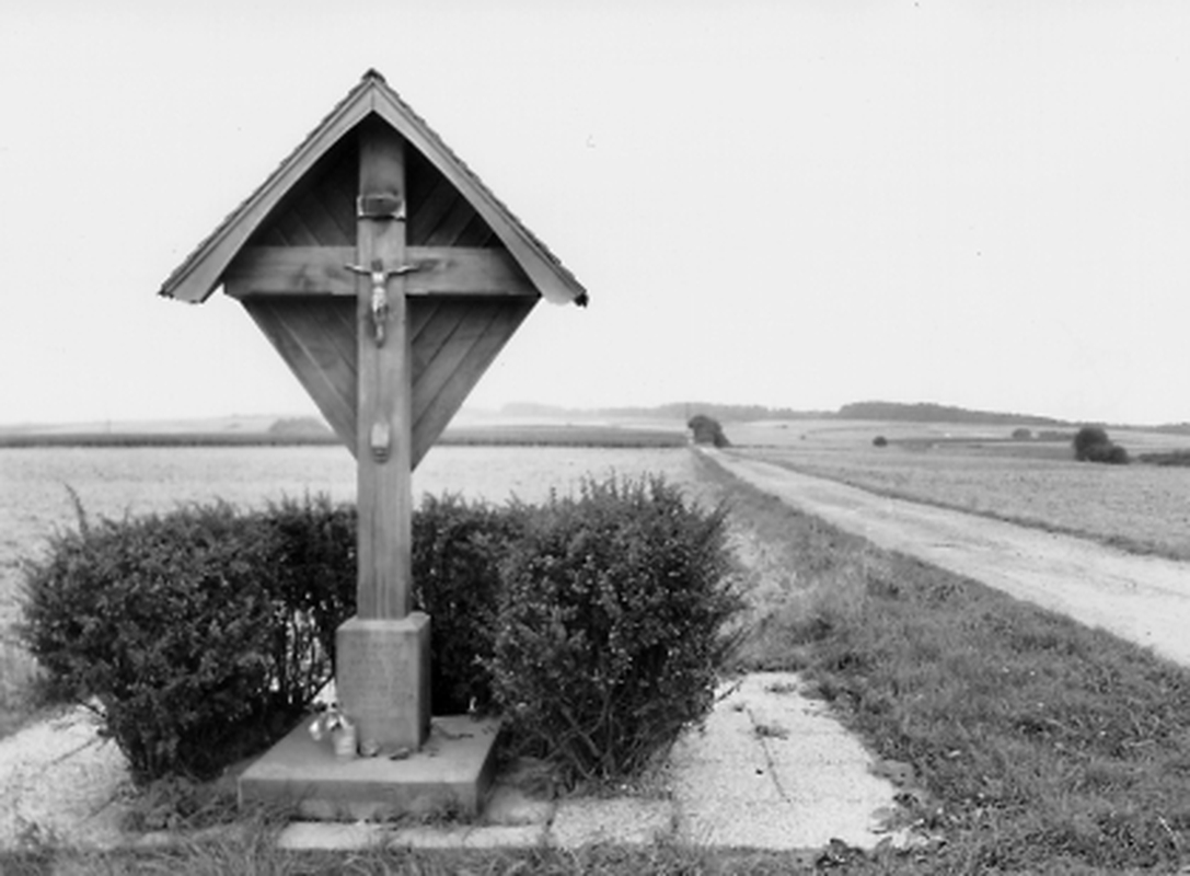 In der Landschaft exponiert auf einer Anhöhe neben der Straße nach Neustadt aufgestelltes Kruzifix. Über Steinplattenunterbau hölzernes Kreuz auf Postament, Korpus aus Holz 1870 geschaffen durch den Bildhauer Dahme aus Warburg. Nach Beschädigung 1993 erneut eingeweiht.