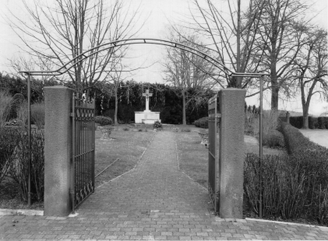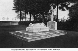 Kriegerehrenmal des Ersten und Zweiten Weltkrieges als eingezäunte Anlage, die durch ein schmiedeeisernes Tor zwischen zwei massiven Torpfosten erschlossen wird. Unter zwei Trauerweiden ein auf gestuftem Unterbau aufgebahrter Soldat in Uniform und Ausrüstung, der Kopf der etwas überlebensgroßen Figur ist auf den Tornister gebettet, die Hände sind über der Brust gefaltet. Hinter der Aufbahrung ein ebenfalls in Kunststein errichtetes Kreuz mit kleinem metallenem Korpus. Die nach 1945 entstandene Anlage ist dem Friedhof vorgelagert. Sie steht aus geschichtlichen Gründen unter Denkmalschutz.