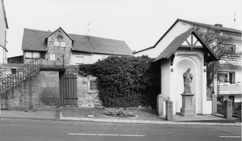 Standbild des hl.Bonifatius auf Postament mit Bodenplatte und rechteckigem Sockel, auf der Rückseite die Jahreszahl 1903, auf der Vorderseite ein vertieftes Rundbogen- Inschriftfeldt: "Sancte Bonifati, Germanorum Apostole ora pro nobis"; vormals stand an gleicher Stelle ein Heiligenhäuschen mit einer Holzfigur der schmerzhaften Gottesmutter. Das Standbild ist durch einen Schutzbau als Rundbogennische mit Satteldach überdeckt. Ortsgeschichtliche Bedeutung als Beleg für das Fortleben religiöser Traditionen auf dem Lande.