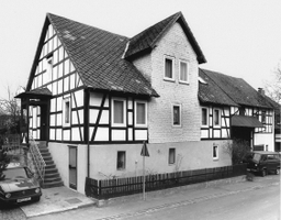 An der Einmündung des Hardtweges städtebaulich exponiert angesiedelter Streckhof, der sich entlang der Straße abwickelt, das über hohem Sockel errichtete Wohnhaus giebelseitig über eine original erhaltene, einläufige Sandsteintreppe mit überkragender Podestplatte erschlossen, die Straßentraufe durch ein großes holzschindelbehangenes Zwerchhaus betont, das Fachwerk deutet in seinem konstruktiven Gefüge auf eine Bauzeit im letzten Drittel des 19.Jhs.hin. Die giebelseitig anschliessende Scheune ist etwa zeitgleich entstanden. Beide Gebäude sind auf dem Dach noch mit diagonal verlegten Betonplatten gedeckt.