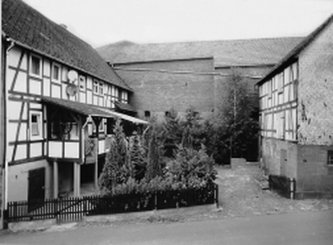 Parallelhofanlage aus dem ausgehenden 19. Jh., deren Wohnhaus als Kopfbau des nördlich der Kirche angesiedelten Platzes fungiert. Am östlichen Ende des Platzes, der von einem größeren Baum bestanden ist, erhebt sich über hohem Werksteinsockel der ursprünglich als Einhaus errichtete Rähmbau in konstruktivem Fachwerk, das Dach ist noch mit Betondachplatten gedeckt. Auf der gegenüberliegenden Seite des teilweise in Sandstein gepflasterten Hofs ein zeitgleiches Wirtschaftsgebäude, ebenfalls auf hohem Werksteinsockel, die Giebelfassade mit historischen Holzschindeln verkleidet.