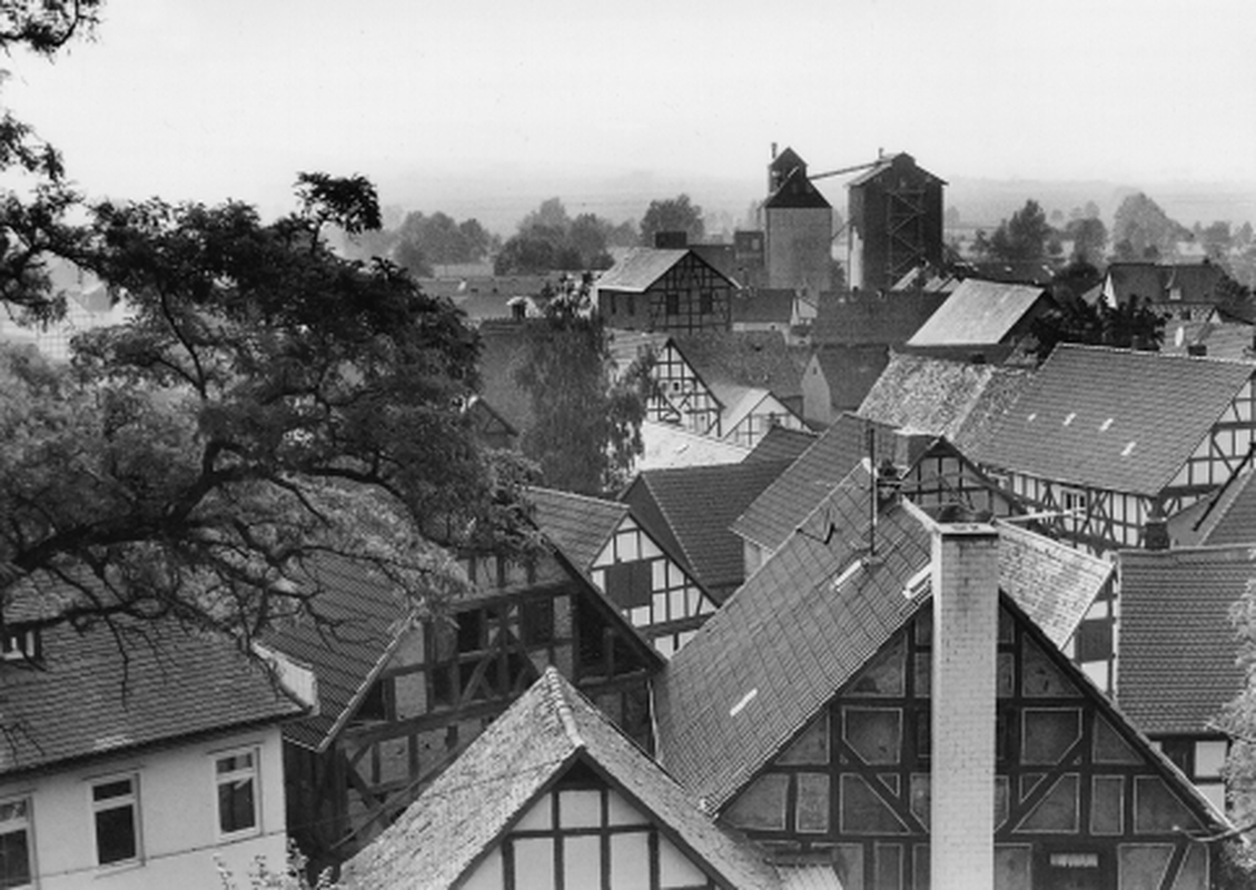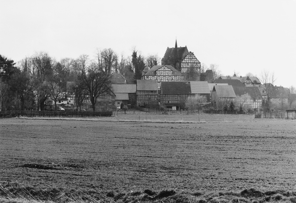 Die wohl in den Jahren zwischen 1256 und 1264 angelegte Siedlungsstruktur hat sich bis heute erhalten und bestimmt charakteristisch das Ortsbild. Die meist giebelständigen Wohnhäuser sind dicht an der Straße angeordnet, die Wirtschaftsgebäude befinden sich im hinteren Teil des Grundstückes und bilden in Teilbereichen noch eine geschlossene Reihung, die ehemals wohl auch als wehrhafter Scheunenkranz ausgebildet war, wie er z. B. aus Mardorf überliefert ist.