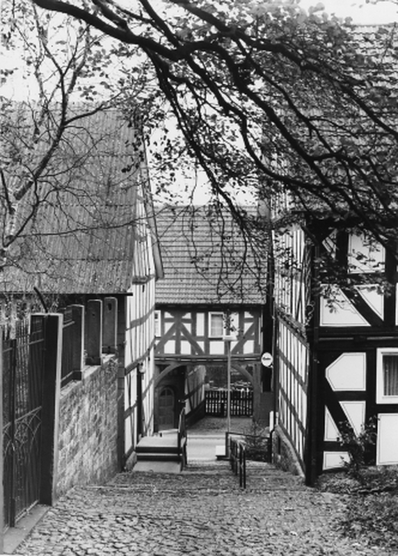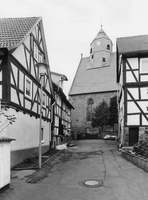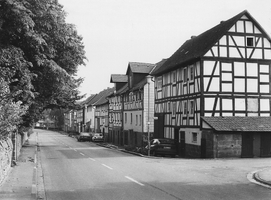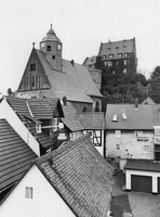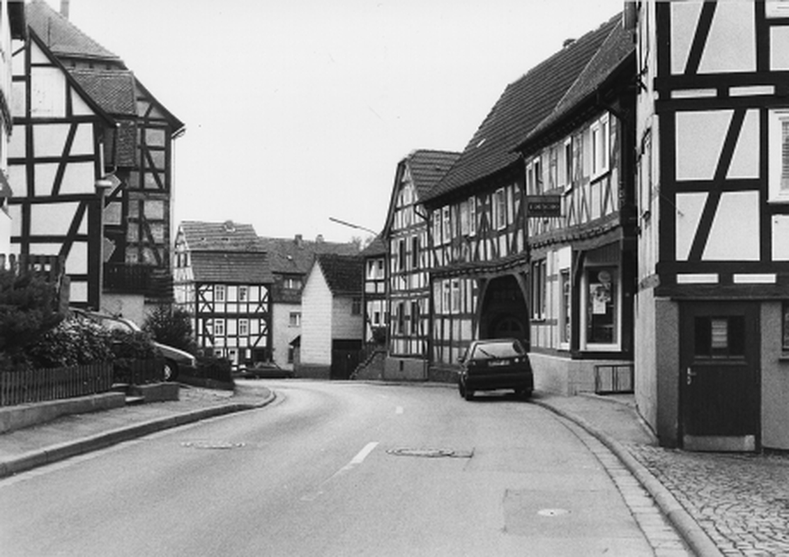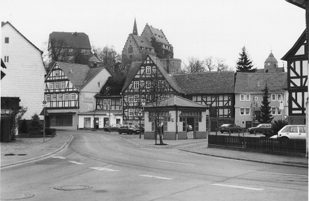 Neben den bürgerlichen und den eher kleinbäuerlichen Hofstätten, die sich im äußeren Ringbereich der Stadt befinden, sind im inneren Bereich die etwa in der Zeit der Siedlungsgründung gestiftete Kirche sowie im unmittelbaren Schutz der Burg drei großvolumige Schenck´sche Hofanlagen angesiedelt. Als Ober-, Mittel- und Unterhof sind die Anwesen zur Straße durch Mauern und Tore abgegrenzt, nach Durchschreiten großflächiger Hofbereiche werden zwei der Haupthäuser über wirkungsvoll inszenierte Treppenanlagen erschlossen. Die breitgelagerten, durch Zwerchhäuser, knaufverzierte Walm- oder Mansarddächer sowie Gaubenbesatz repräsentativ ausgestatteten Bauten sind mit der rückwärtigen Traufseite an die Burg angebunden. Die Vorderseite richtet ihren Blick auf die tieferliegende Siedlung und in die freie Landschaft, die sich bereits jenseits der Friedhofstraße ausbreitet. Die Reihung der Höfe entlang der Straße bestimmt wesentlich das Stadtbild in der "Neustadt". Die nördliche Straßenseite ist hier von Fachwerkgebäuden besetzt, die durch ihren Wechsel aus Trauf- und Giebelständigkeit sowie ihre unterschiedliche Höhenentwicklung eine lebhafte Gliederung herbeiführen. Ihre Grundstücke reichen schmal geschnitten weit in die Tiefe, die im Falle von "Neustadt" 41 bis 51 mit fünf dicht aneinandergereihten Tagelöhnerhäuschen besetzt wird. Eine städtebaulich kontrastierende Aufweitung entsteht im Westen beim Zusammentreffen mit der Straße Im Tal. In Dreiecksform bildet sich hier der Marktplatz heraus. An seinen Rändern bildet die vorwiegend traufständig ausgerichtete, teilweise verputzte Bebauung mit den eingestreuten Sichtfachwerkgiebeln eine beeindruckende Kulisse. Einen Teil der Gesamtanlage in diesem Bereich bildet das Wohn- und Geschäftshaus Markt 16, das durch die Fassadengestaltung der oberen Geschosses aus der Zeit des Heimatstils mit Haus 14 eine formale Einheit herstellt. Als nordwestlicher Fortsatz der Bebauung am Marktplatz ist die Gebäudereihe Biegenstraße 3-9 anzusehen. Noch im Plan von 1774/75 ist an ihrer rückseitigen Traufe der Mühlbach zu erkennen, dessen Verlauf die Häuser noch der Stadt zuordnete. Sie sind als Tagelöhneranwesen mit einer unteren Stall- und Vorratszone sowie dem darüberliegenden Wohngeschoß in Ständerbauweise angelegt, die dritte Ebene ist in Form einer Stockwerkskonstruktion aufgesetzt.