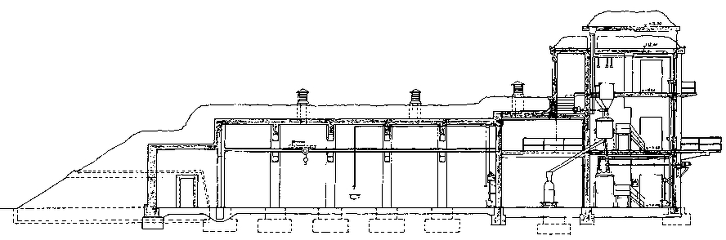 Insgesamt wurden 413 feste Gebäude errichtet, davon dienten 168 der Produktion. Im Allgemeinen waren die Bauten als standardisierte Stahlbetonoder Stahlbetonskelettkonstruktionen errichtet. Der obere Abschluß wurde zum Zweck der Tarnung als Flachdach mit Erdaufschüttung und Bepflanzung durch immergrüne Sträucher und Bäume ausgeführt. Die massiven Stahlbetonrahmen waren in Leichtbauweise mit Bims- oder Ziegelmauerwerk ausgefacht. Diese vordefinierten Schwachstellen gaben bei Explosionen als erste der Druckwelle nach, ohne daß es zu größeren Schäden an der Tragkonstruktion kam. Die hohen Erdwälle, die um die Gebäude herum angelegt waren, dienten dazu, bei Explosionen die Druckwelle nach oben umzulenken und somit umstehende Gebäude zu schützen.