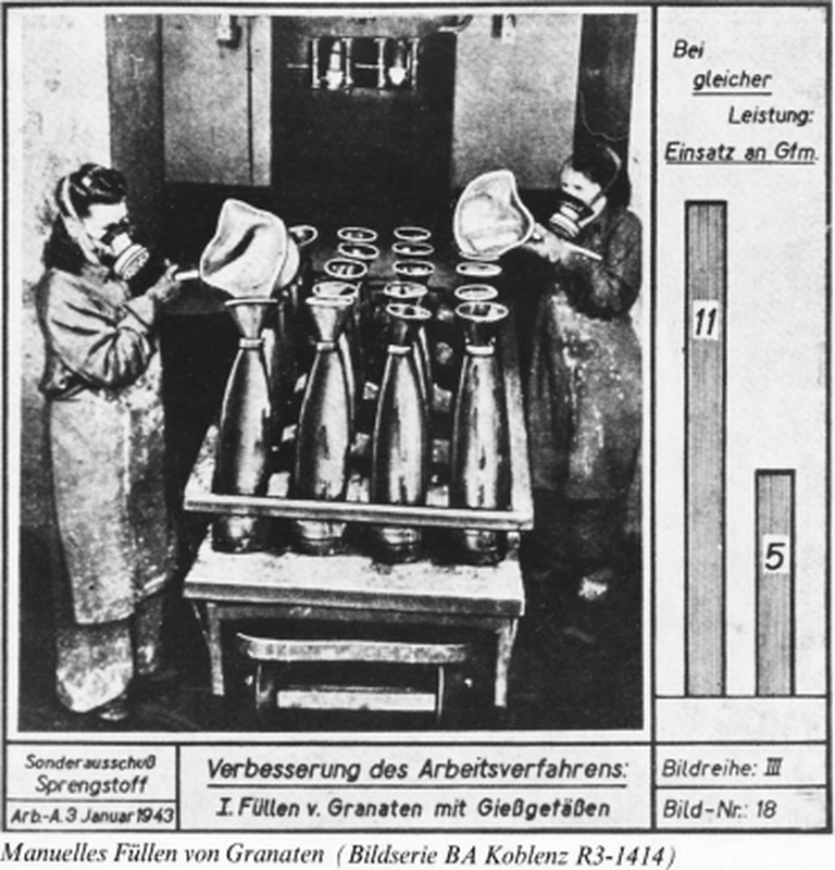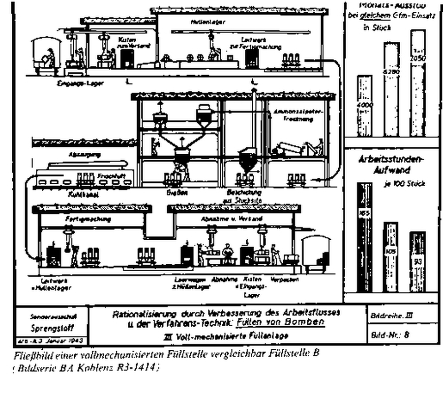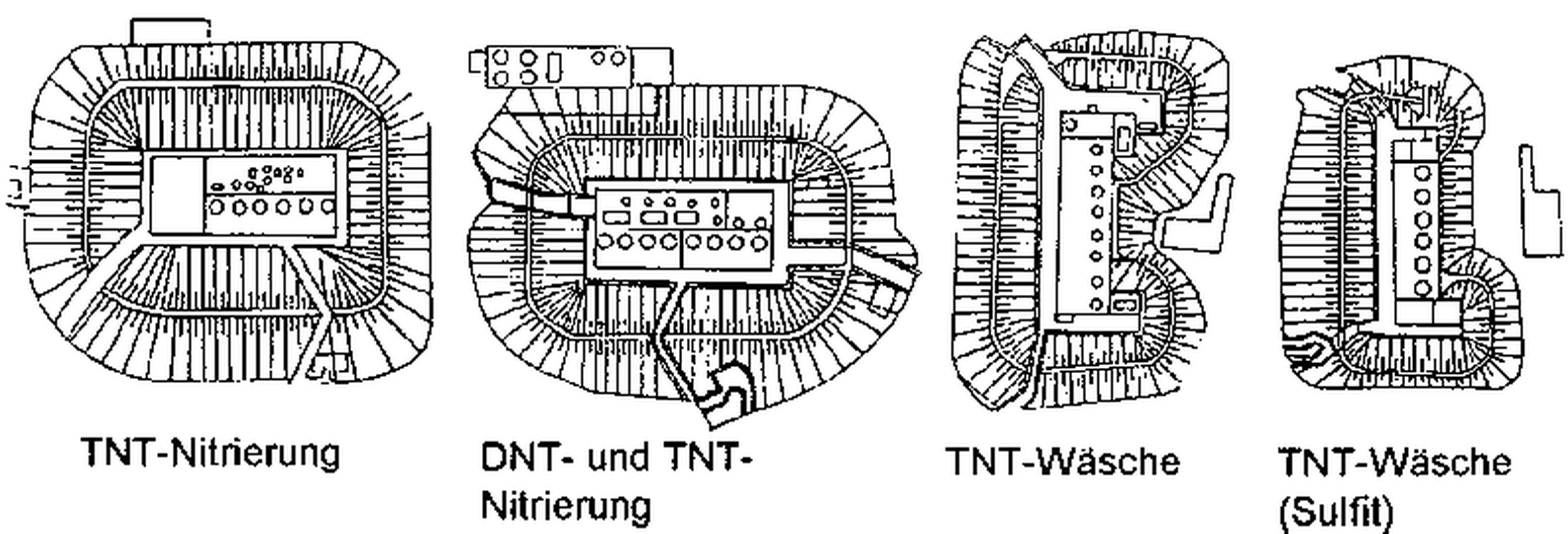 Bei der Herstellung von TNT-Sprengstoff (Trinitrotoluol) dienten außer Toluol das von anderen chemischen Werken bezogene Mononitrotoluol als Ausgangsverbindung. Die Überführung des Toluol bzw. Mononitrotoluol über das Dinitro- und Trinitrotoluol verlangt ein hochkonzentriertes Salpeter-/Schwefelsäuregemisch, die Nitriersäure. Erst nach mehreren Durchläufen und Waschvorgängen erhält man das symmetrische Tri, auch als 2.4.6.-Trinitrotoluol bezeichnet, das als eigentlicher beständiger Sprengstoff in Betracht kommt. TNT ist unempfindlich gegen Stoß und Schlag und hat eine hohe Zündtemperatur, kann daher geschmolzen und gepreßt werden. Der Nitriervorgang allerdings ist äußerst sicherheitsempfindlich, da bereits Temperaturerhöhungen von wenigen Grad zu einer Verpuffung führen können. In einem Nitriervorgang wurden 4.000 kg Sprengstoff hergestellt, so daß eine mögliche Explosion folgenschwere Auswirkungen auf die Mitarbeiter und die umliegenden Ortschaften gehabt hätte.