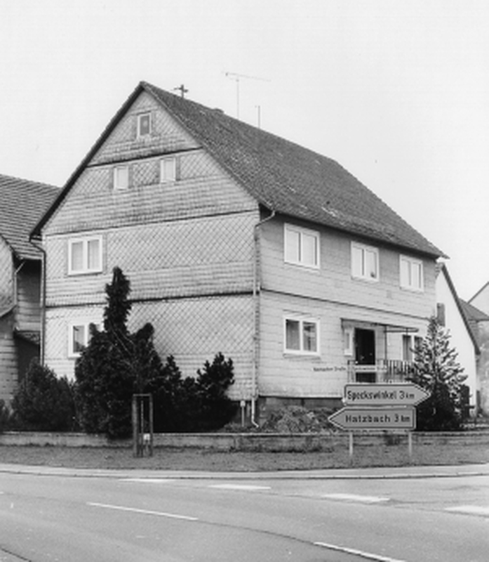 Vollständig mit Platten verkleidetes Wohnhaus auf Werksteinsockel in Ecklage zur Hatzbacher Straße. Unter der Verkleidung ist ein Rähmbau der ersten Hälfte des 19. Jhs. mit noch leichtem Geschoßüberstand und konvergierenden Verstrebungen zu erwarten. Der Bau ist durch seine Stellung in der Sichtachse der Hatzbacher Straße von städtebaulicher Bedeutung.