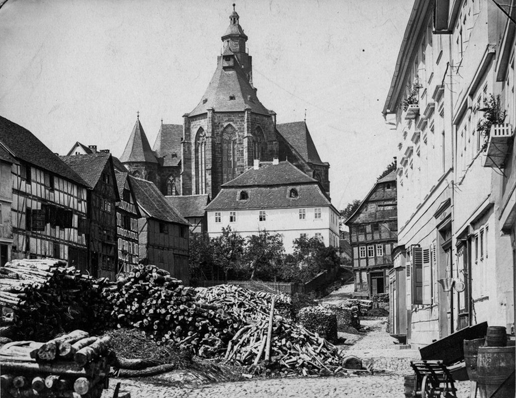Landgraf-Friedrich-Straße 17-39, 24-44; Mittelstraße 7. Die Anlage des Ortsgrundrisses von Friedrichshausen erfolgte planmäßig. In Nord-Süd-Richtung wurde die Landgraf-Friedrich-Straße trassiert, an der 1776 zunächst zehn Fachwerkhäuser errichtet wurden. Bereits 1778 wurde die Kolonie um zehn Häuser erweitert. Beidseitig der Landgraf-Friedrich-Straße waren nun je zehn schmale, tiefe Parzellen abgeteilt. Mittig kreuzt die Mittelstraße den Straßenverlauf. Dieser planmäßig angelegte Grundriss ist bis heute ablesbar geblieben, obwohl einige Parzellen im Laufe der Jahre zusammengelegt oder geteilt wurden. Auf der östlichen Seite der Landgraf-Friedrich-Straße sind die größeren Veränderungen zu beobachten. Hier wurde zum einen die Mittelstraße verschmälert, um einen zusätzlichen Bauplatz zu schaffen, zum anderen die südlichste Parzelle nach Süden um das doppelte erweitert. Auf den Parzellen befinden sich Hofreiten aus der zweiten Hälfte des 19. und des frühen 20. Jahrhunderts mit zweigeschossigen Fachwerkgebäuden, die von Satteldächern abgeschlossen sind. Die ebenfalls zweigeschossige zweite Fachwerkschule ist auf einer der westlich gelegenen Parzelle erbaut worden. Erst 1904 ist axial am südlichen Ende der Landgraf-Friedrich-Straße die dritte Schule errichtet worden, die einen Sichtabschluss der Gesamtanlage bildet.