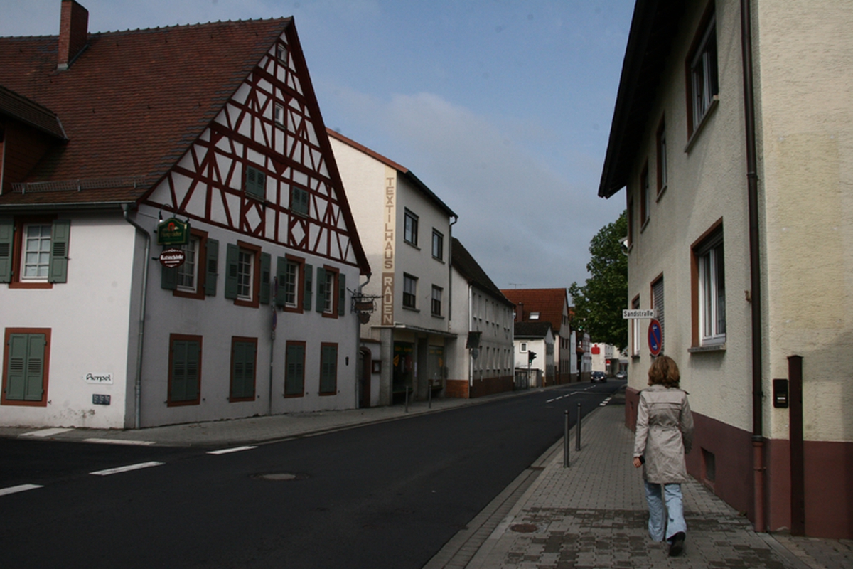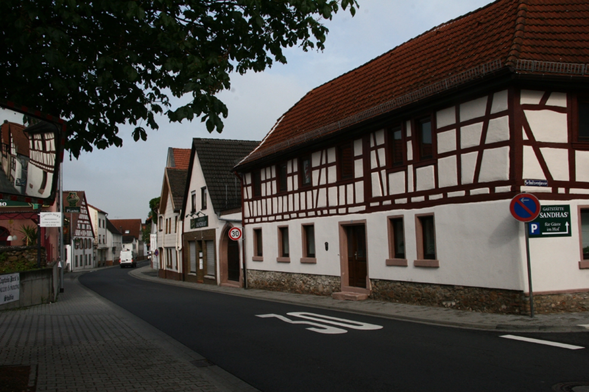 Die Darmstädter Straße als heutige Hauptdurchgangsstraße ist in ihrem mittleren Teil noch durch eine weitgehend intakte Abfolge historischer Gebäude und Hofanlagen geprägt, die die Entwicklung des Ortes insbesondere im 19. Jh. widerspiegeln. Sie besteht im Bereich des zentral gelegenen, vom Straßenlauf zurück gesetzten ehemaligen Schulgebäudes bis zur östlich abgehenden Schulzengasse, auf der gegenüber liegenden Straßenseite wird sie von der nach Süden abzweigenden Sandgasse begrenzt.