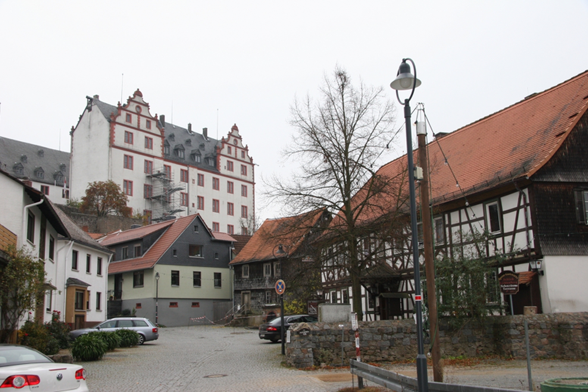 Das Umfeld der im 13. Jahrhundert errichteten, im 16. Jahrhundert durch einen großen Renaissancebau erweiterte Burganlage wird aus einem kleinen Ort gebildet, der sich entlang gewundener, steiler Gassen entwickelt hat. Die historische Parzellenstruktur und Gebäudeanordnung des 17. und 18. Jahrhunderts hat sich im oberen, der Burganlage direkt vorgelagerten Abschnitt weitgehend erhalten. Hier finden sich mehrere Fachwerkbauten einschließlich Nebengebäuden, die in engem Zusammenhang mit der Entwicklung der Burg zu sehen sind und sich teilweise noch innerhalb des äußeren, westlichen Mauerrings befinden, ebenso das im 19. Jahrhundert errichtete Rathaus, das als Eckgebäude mit rundbogigen Fenstern und differenziertem Dachaufbau den Straßenraum dominiert. Der genannte Bereich der Landgraf-Georg-Straße ist einschließlich der umliegenden Grünflächen am unteren Burgberg aufgrund seiner historischen Bedeutung als Gesamtanlage geschützt.