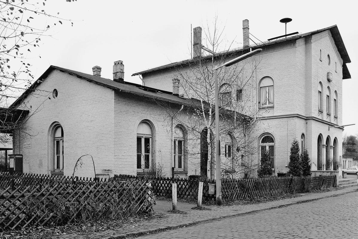 Typenbau von 1873 auf der Stadtseite nördlich der Strecke: Symmetrisches Backsteingebäude aus doppelgeschossigem Giebelbau und niedrigen Anbauten mit Bogenfenstern und axialer Portalgruppe (4:1:3:1:4-Achsen).