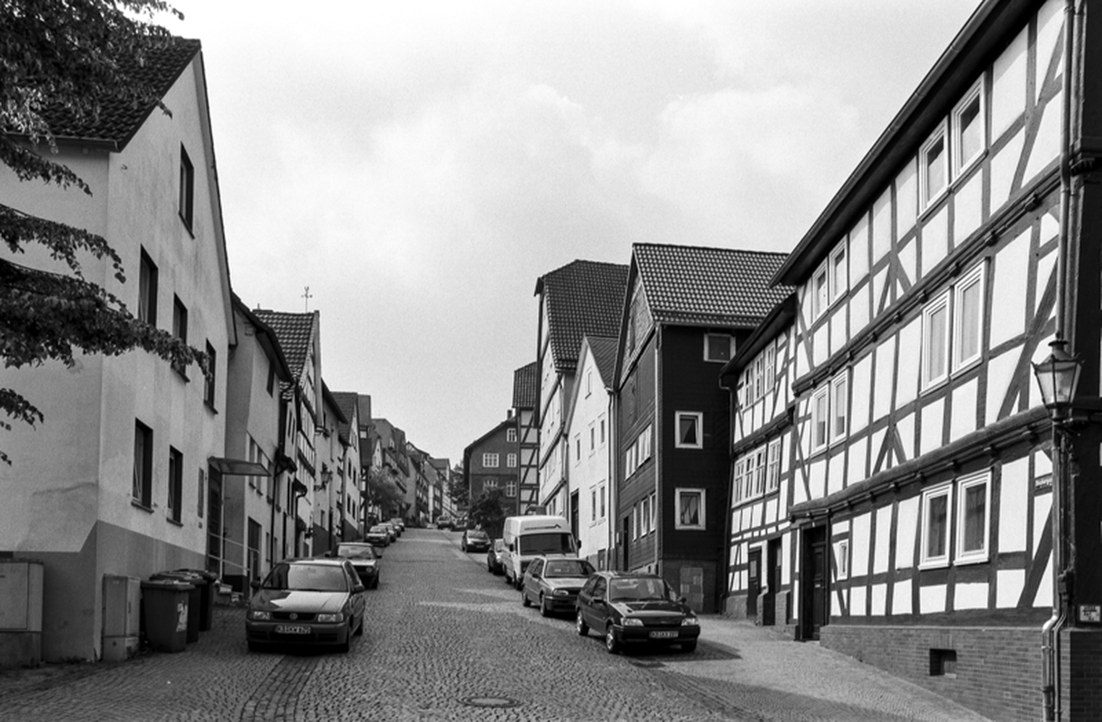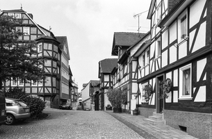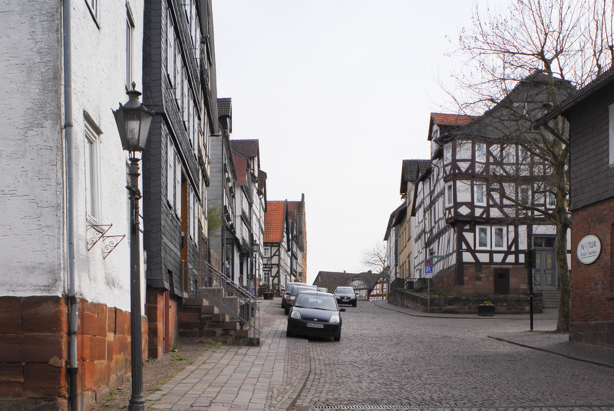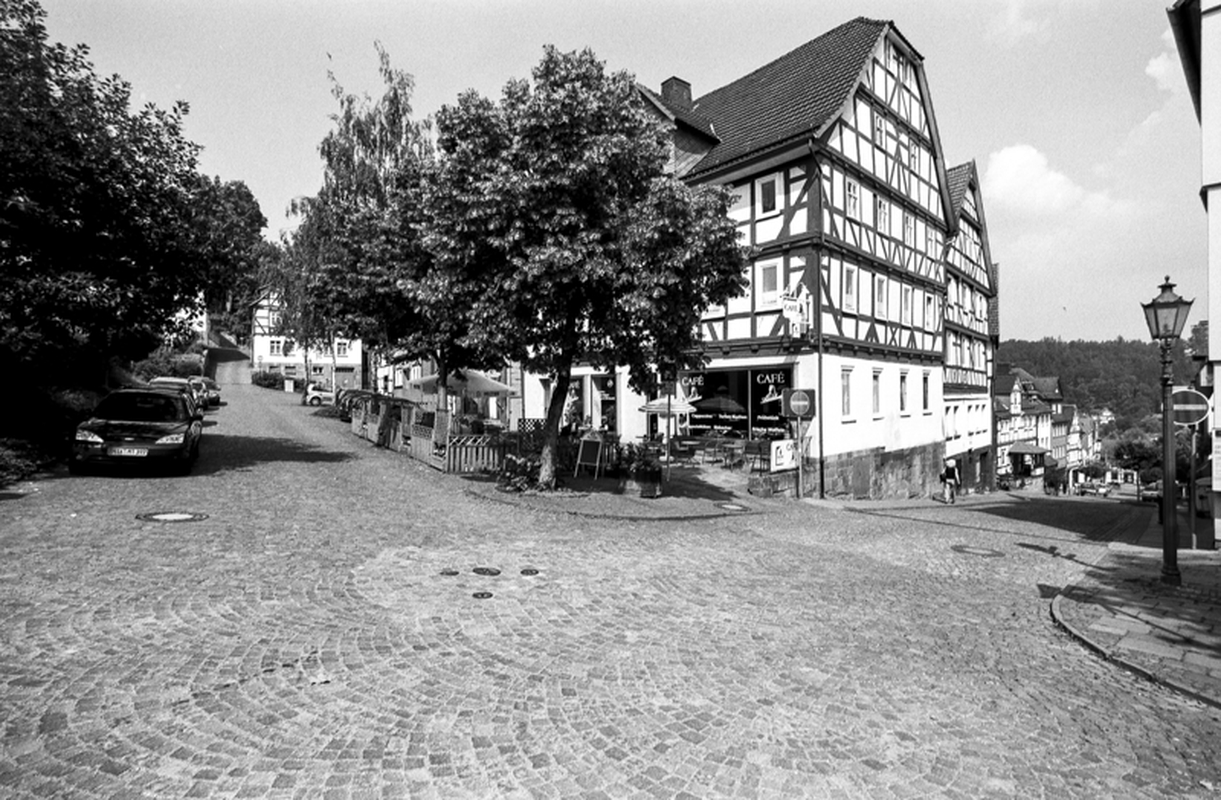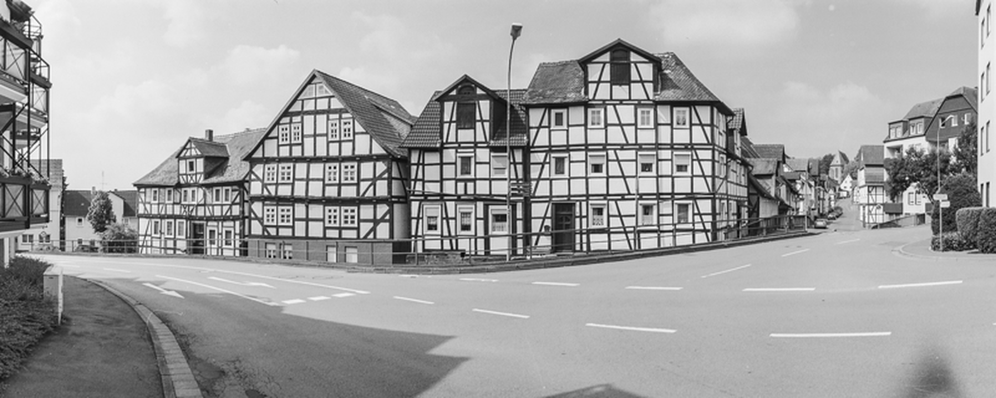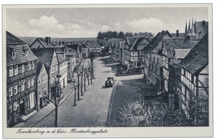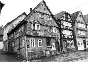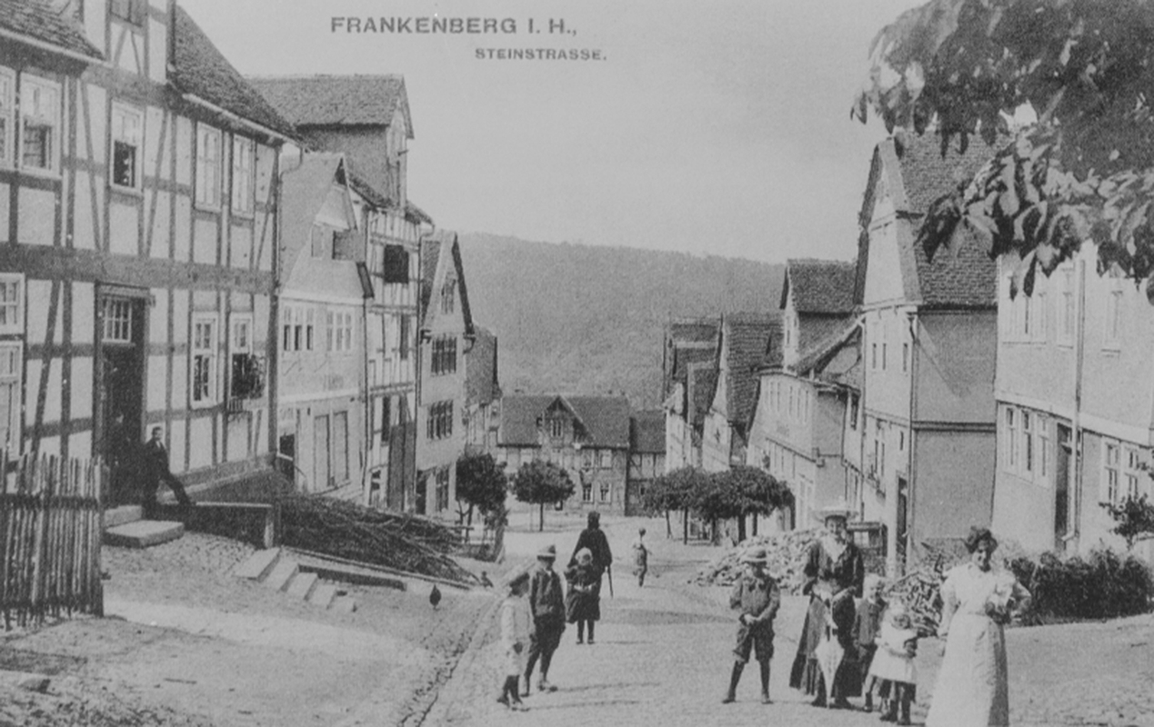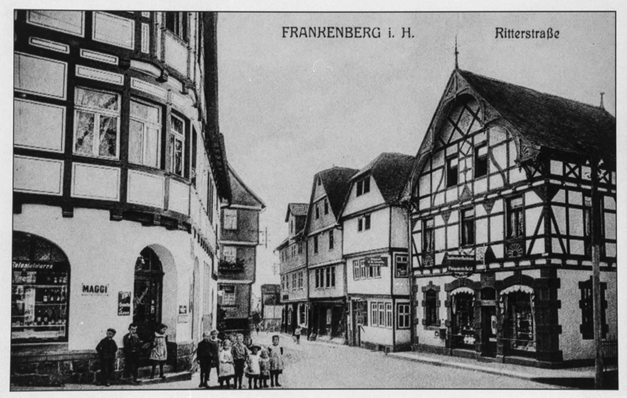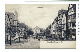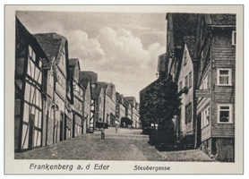 Kern und Ursprung der Stadt Frankenberg ist die Burganlage auf dem Felssporn des Burgberges. 1122 fiel diese Burg an die Landgrafen von Thüringen, die von hier ausgehend versuchten, einen eigenen Herrschaftsbezirk aufzubauen. Daher gründeten sie auf Battenberger Gebiet östlich der Burg im frühen 13. Jahrhundert die 1236 erstmals urkundlich erwähnte Siedlung Frankenberg. Diese wuchs in den folgenden Jahren schnell zu einer Stadt heran. 1248 entstand westlich vor der Stadt das Zisterzienserinnenkloster Georgenberg, im folgenden Jahr ist eine erste Brücke über die Eder bezeugt und 1255 verfügte Frankenberg schon über ein Rathaus. 1262 sind große Teile der späteren Stadtmauer bereits vorhanden, 1267 erhält die Stadt ein Wochen- und Jahrmarktprivileg und ab 1286 wurde die Liebfrauenkirche direkt unterhalb der Burg errichtet.Die Altstadt zeigt drei sich nach Osten aneinander reihende Siedlungskerne. Den westlichsten Punkt bildet die auf dem Bergsporn gelegene Burg, an die sich östlich die Kirche und später das Hospital anschließen. Den gesamten Rest der Berglehne bis hinunter in das Edertal bildet der bis 1288 ummauerte bürgerliche Wohnbezirk. Dem in unterschiedliche Richtungen abschüssigen Baugelände folgend wurde ein bis heute weitgehend unverändertes Straßensystem angelegt, das von zwei sehr breiten sich über 180 m von West nach Ost erstreckenden Marktstraßen abzweigt. Den Mittelpunkt bildet der nördliche Rathausvorplatz, an dem die Weinstraße (Steingasse) vorbeiführt. Parallel zu den beiden Märkten wurde im weniger steilen Süden die heutige Untergasse als relativ breite Straße, die vermutlich auch teilweise Marktfunktionen mit übernahm, trassiert. Nördlich des Untermarktes erschließen vier unterschiedlich steil abfallende Gassen den zur Eder gelegenen unteren Teil der Stadt mit der heutigen Dellbrücke und der Ritterstraße. Die östlichste dieser Gassen (Steubergasse, Pferdemarkt, Linnertorstraße) bildet von Anfang an einen breiten auch als Markt genutzten Riegel, der quer zu den beiden Märkten liegt und die Möglichkeit zur Querung der Stadt vom Linnertor zum Geismarer Tor bietet. Eine weitere Querachse (Auf der Heide) schließt die Stadt nach Osten ab. Östlich dieser breiten Trasse schließen sich nur noch Gärten an, die bis zur Stadtmauer reichten.Die prosperierende Altstadt wurde im Jahre 1476 Opfer eines Stadtbrandes, bei dem bis auf das Steinhaus (Pferdmarkt 20) und Teile der Kirche die gesamte Stadt vernichtet wurde. Wie Gerstenberg in seiner Stadtchronik niederschrieb „da herhub sich leyder eyn gruslich fur in der Mittelgassin, (..) an dem orthuse wan man in die Smiddegassen geen wil. Unde wywole vor keyn wynt enwas, sunder eyn gantz stille heiss tag, ydoch herhub sich der wynt von der Edern herane unde furte das fur uff die anderen husser zu der kirchin wert, so das die stad an vilen enden aneginck. (...) Nu hatte das fur gantz obbirnhant genummen unde brante in allen gassen, so das die husse zusammenvilen in die strasse, das nymants mee gewandern noch gelesschin enkonde. Da kam das fur auch an das raithuss. In demselbin husse hatte die stad ire bussen, pulver, armbruste (...) Unde als das fur darane quam, da gingen sie alle loiss, die kleynen mit den groissen. Derselbin groissin eyne die schoss widder das Steynen huss bei dem Groissin borne unde schoss die mure tzusschin tzween crutzefenstern entzwey. Alsus nam die stad grossin verderplichin schaden uff dem raithusse, (..). Dar quam das fur vorterss, unde nam meistenteil alle gassen in der aldenstad vor.Bynamen verbrante die Mittelgasse, die Stoubegasse. Die Rittergasse, die Asschergasse, die Smiddegasse, die Steyngasse, der Leckerberg, der Paffinberg, der Hinderberg, die Roddenergasse eynteil, der burckberg, der Hepenberg, das Martt, dy Huntgasse die Tichgasse, die Undergasse, die Lynnergasse eynteil, die Hindergasse, unde der Heyde eynteilss na der Geissmarporten wert." Dieser Rückschlag verstärkte die Tendenz des durch die Verlegung der Handelswege schon zuvor zurückgehenden Handels in einem Maße, dass sich die Stadt bis in das späte 19. Jahrhundert nicht mehr davon erholte. Schon für den Wiederaufbau im frühen 16. Jahrhundert waren umfangreiche Zuschüsse aus einer Landeskollekte nötig. Viele private Bauherren waren vollständig verarmt, so dass noch im späten 18. Jahrhundert an einigen Stellen in der Stadt Baulücken bestanden. Noch in der zweiten Hälfte des 19. Jahrhunderts bot die Stadt aufgrund der wirtschaftlichen Stagnation sowie des geringen Bevölkerungs- und Baudruckes genügend Bauflächen innerhalb der Mauern. Allein diesem Umstand ist es zu verdanken, dass sich die Altstadt Frankenbergs heute als nahezu geschlossenes Fachwerkensemble mit Gebäuden aus der Zeit des frühen 16. bis späten 19. Jahrhunderts zeigt.Die ältesten, kurz nach 1500 entstandenen Fachwerkhäuser weisen noch deutlich die Tradition der mittelalterlichen Ständer- oder Geschossbauweise auf. Zwar wurde das seit 1509 errichtete Rathaus als seinerzeit moderner Stockwerksbau verzimmert, doch zeigen andere Häuser noch fast vollständige Ständerbauweise, die lediglich an den Straßenfassaden durch „Scheinstockwerke" ein moderneres Gepräge erhielten. Der sich bald im 16. Jahrhundert durchsetzende giebelständige Stockwerksbau mit hohen Erdgeschossen, Geschossüberkragungen und Mannfiguren als Zier- und Aussteifungsformen wurde in der Stadt sehr lange gepflegt. Noch zu Beginn des 19. Jahrhunderts findet man Vertreter dieses Baustils an vielen Stellen der Altstadt. Seit dem frühen 18. Jahrhundert gesellen sich aber zunehmend traufständige Fachwerkhäuser mit einfacherer Gefügekonstruktion und Zwerchhäusern dazu, die dann im Laufe des 19. Jahrhunderts prägend werden. Ein besonderes Merkmal des Fachwerks in Frankenberg sind die zumeist im 16. Jahrhundert ausgeführten Zierausmauerungen der Gefache mit flachen Ziegeln und eine Vielzahl noch heute erhaltener zweigeschossiger Eckerker, die Kreuzungen 