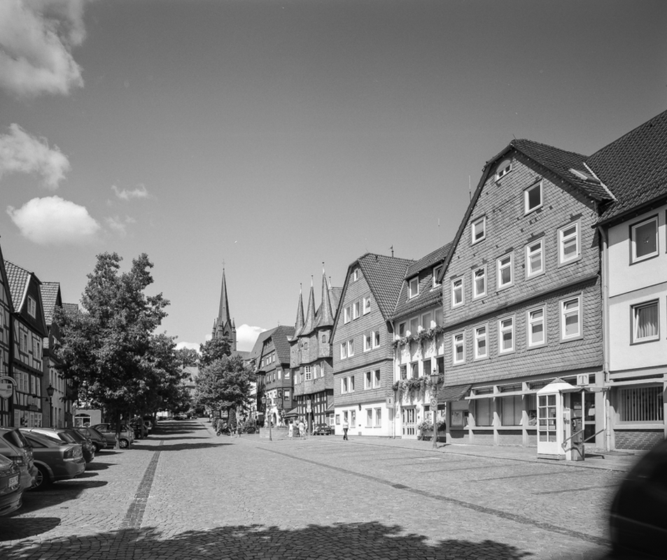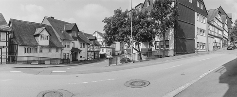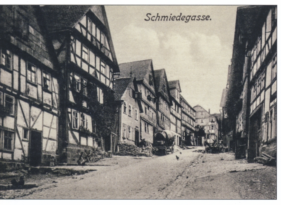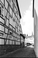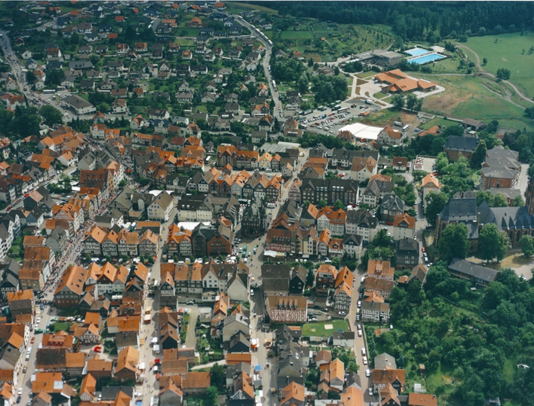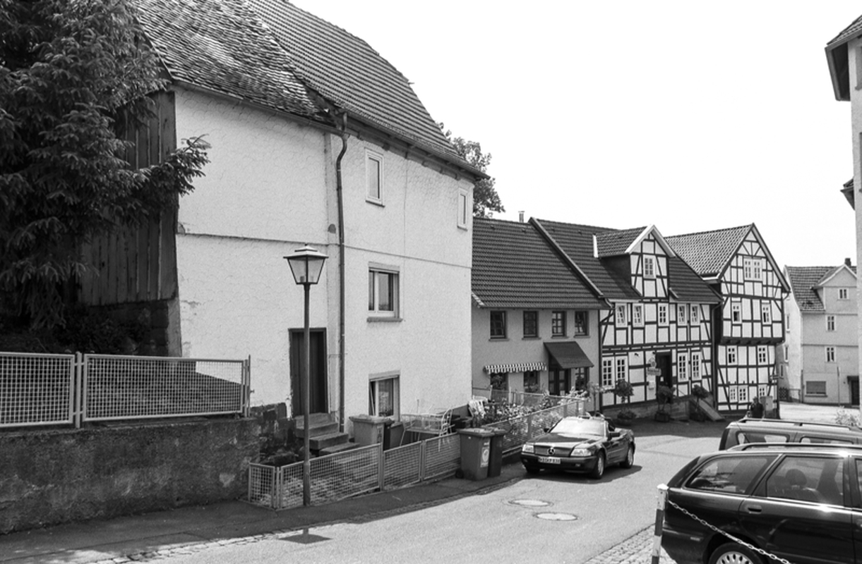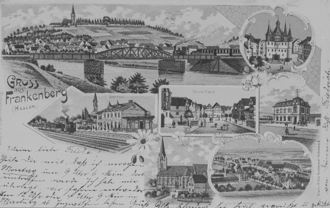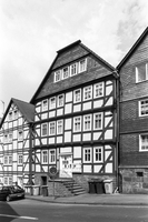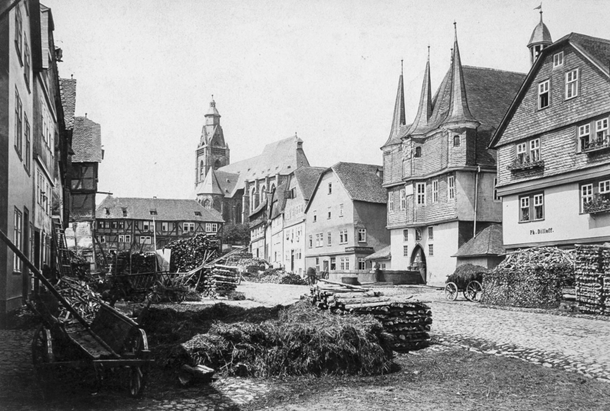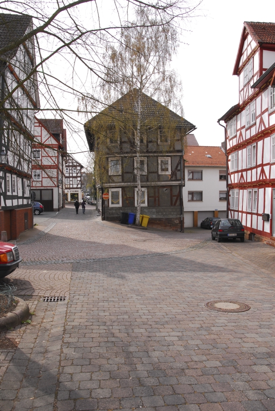 Kern und Ursprung der Stadt Frankenberg ist die Burganlage auf dem Felssporn des Burgberges. 1122 fiel diese Burg an die Landgrafen von Thüringen, die von hier ausgehend versuchten, einen eigenen Herrschaftsbezirk aufzubauen. Daher gründeten sie auf Battenberger Gebiet östlich der Burg im frühen 13. Jahrhundert die 1236 erstmals urkundlich erwähnte Siedlung Frankenberg. Diese wuchs in den folgenden Jahren schnell zu einer Stadt heran. 1248 entstand westlich vor der Stadt das Zisterzienserinnenkloster Georgenberg, im folgenden Jahr ist eine erste Brücke über die Eder bezeugt und 1255 verfügte Frankenberg schon über ein Rathaus. 1262 sind große Teile der späteren Stadtmauer bereits vorhanden, 1267 erhält die Stadt ein Wochen- und Jahrmarktprivileg und ab 1286 wurde die Liebfrauenkirche direkt unterhalb der Burg errichtet.Die Altstadt zeigt drei sich nach Osten aneinander reihende Siedlungskerne. Den westlichsten Punkt bildet die auf dem Bergsporn gelegene Burg, an die sich östlich die Kirche und später das Hospital anschließen. Den gesamten Rest der Berglehne bis hinunter in das Edertal bildet der bis 1288 ummauerte bürgerliche Wohnbezirk. Dem in unterschiedliche Richtungen abschüssigen Baugelände folgend wurde ein bis heute weitgehend unverändertes Straßensystem angelegt, das von zwei sehr breiten sich über 180 m von West nach Ost erstreckenden Marktstraßen abzweigt. Den Mittelpunkt bildet der nördliche Rathausvorplatz, an dem die Weinstraße (Steingasse) vorbeiführt. Parallel zu den beiden Märkten wurde im weniger steilen Süden die heutige Untergasse als relativ breite Straße, die vermutlich auch teilweise Marktfunktionen mit übernahm, trassiert. Nördlich des Untermarktes erschließen vier unterschiedlich steil abfallende Gassen den zur Eder gelegenen unteren Teil der Stadt mit der heutigen Dellbrücke und der Ritterstraße. Die östlichste dieser Gassen (Steubergasse, Pferdemarkt, Linnertorstraße) bildet von Anfang an einen breiten auch als Markt genutzten Riegel, der quer zu den beiden Märkten liegt und die Möglichkeit zur Querung der Stadt vom Linnertor zum Geismarer Tor bietet. Eine weitere Querachse (Auf der Heide) schließt die Stadt nach Osten ab. Östlich dieser breiten Trasse schließen sich nur noch Gärten an, die bis zur Stadtmauer reichten.Die prosperierende Altstadt wurde im Jahre 1476 Opfer eines Stadtbrandes, bei dem bis auf das Steinhaus (Pferdmarkt 20) und Teile der Kirche die gesamte Stadt vernichtet wurde. Wie Gerstenberg in seiner Stadtchronik niederschrieb „da herhub sich leyder eyn gruslich fur in der Mittelgassin, (..) an dem orthuse wan man in die Smiddegassen geen wil. Unde wywole vor keyn wynt enwas, sunder eyn gantz stille heiss tag, ydoch herhub sich der wynt von der Edern herane unde furte das fur uff die anderen husser zu der kirchin wert, so das die stad an vilen enden aneginck. (...) Nu hatte das fur gantz obbirnhant genummen unde brante in allen gassen, so das die husse zusammenvilen in die strasse, das nymants mee gewandern noch gelesschin enkonde. Da kam das fur auch an das raithuss. In demselbin husse hatte die stad ire bussen, pulver, armbruste (...) Unde als das fur darane quam, da gingen sie alle loiss, die kleynen mit den groissen. Derselbin groissin eyne die schoss widder das Steynen huss bei dem Groissin borne unde schoss die mure tzusschin tzween crutzefenstern entzwey. Alsus nam die stad grossin verderplichin schaden uff dem raithusse, (..). Dar quam das fur vorterss, unde nam meistenteil alle gassen in der aldenstad vor.Bynamen verbrante die Mittelgasse, die Stoubegasse. Die Rittergasse, die Asschergasse, die Smiddegasse, die Steyngasse, der Leckerberg, der Paffinberg, der Hinderberg, die Roddenergasse eynteil, der burckberg, der Hepenberg, das Martt, dy Huntgasse die Tichgasse, die Undergasse, die Lynnergasse eynteil, die Hindergasse, unde der Heyde eynteilss na der Geissmarporten wert." Dieser Rückschlag verstärkte die Tendenz des durch die Verlegung der Handelswege schon zuvor zurückgehenden Handels in einem Maße, dass sich die Stadt bis in das späte 19. Jahrhundert nicht mehr davon erholte. Schon für den Wiederaufbau im frühen 16. Jahrhundert waren umfangreiche Zuschüsse aus einer Landeskollekte nötig. Viele private Bauherren waren vollständig verarmt, so dass noch im späten 18. Jahrhundert an einigen Stellen in der Stadt Baulücken bestanden. Noch in der zweiten Hälfte des 19. Jahrhunderts bot die Stadt aufgrund der wirtschaftlichen Stagnation sowie des geringen Bevölkerungs- und Baudruckes genügend Bauflächen innerhalb der Mauern. Allein diesem Umstand ist es zu verdanken, dass sich die Altstadt Frankenbergs heute als nahezu geschlossenes Fachwerkensemble mit Gebäuden aus der Zeit des frühen 16. bis späten 19. Jahrhunderts zeigt.Die ältesten, kurz nach 1500 entstandenen Fachwerkhäuser weisen noch deutlich die Tradition der mittelalterlichen Ständer- oder Geschossbauweise auf. Zwar wurde das seit 1509 errichtete Rathaus als seinerzeit moderner Stockwerksbau verzimmert, doch zeigen andere Häuser noch fast vollständige Ständerbauweise, die lediglich an den Straßenfassaden durch „Scheinstockwerke" ein moderneres Gepräge erhielten. Der sich bald im 16. Jahrhundert durchsetzende giebelständige Stockwerksbau mit hohen Erdgeschossen, Geschossüberkragungen und Mannfiguren als Zier- und Aussteifungsformen wurde in der Stadt sehr lange gepflegt. Noch zu Beginn des 19. Jahrhunderts findet man Vertreter dieses Baustils an vielen Stellen der Altstadt. Seit dem frühen 18. Jahrhundert gesellen sich aber zunehmend traufständige Fachwerkhäuser mit einfacherer Gefügekonstruktion und Zwerchhäusern dazu, die dann im Laufe des 19. Jahrhunderts prägend werden. Ein besonderes Merkmal des Fachwerks in Frankenberg sind die zumeist im 16. Jahrhundert ausgeführten Zierausmauerungen der Gefache mit flachen Ziegeln und eine Vielzahl noch heute erhaltener zweigeschossiger Eckerker, die Kreuzungen 