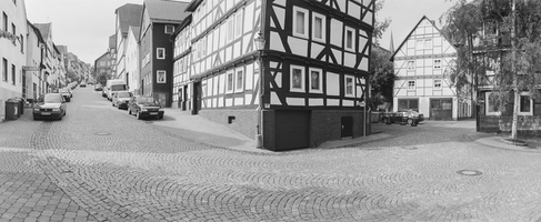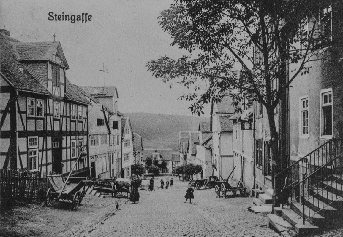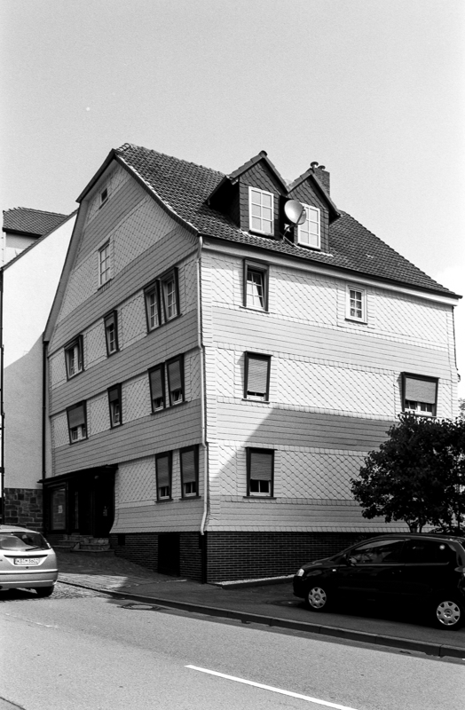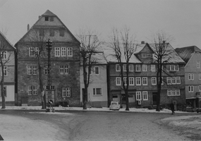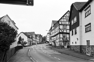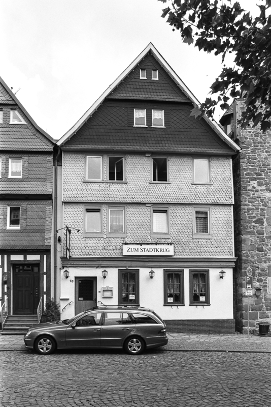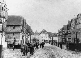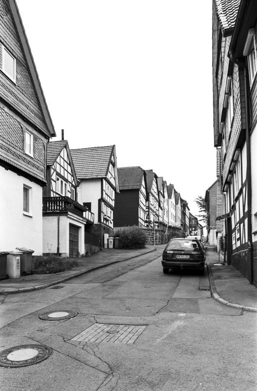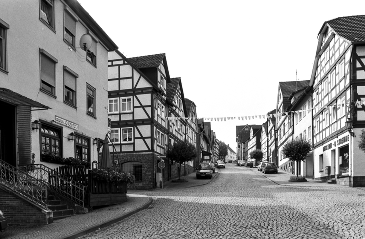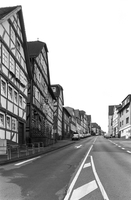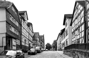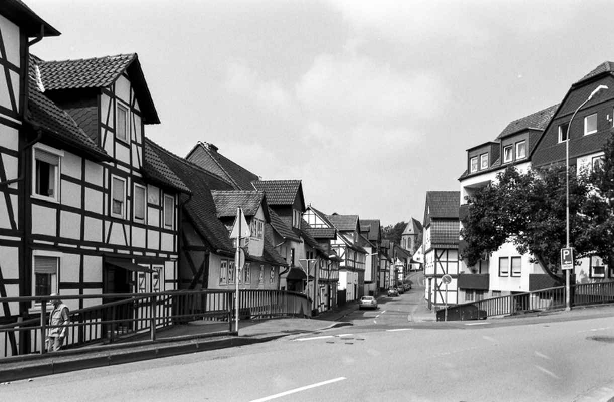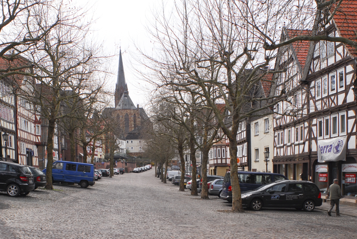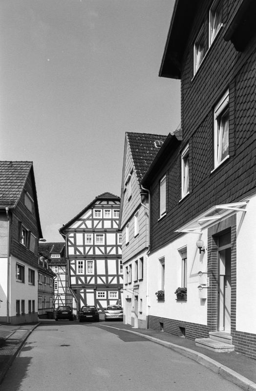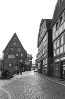 Kern und Ursprung der Stadt Frankenberg ist die Burganlage auf dem Felssporn des Burgberges. 1122 fiel diese Burg an die Landgrafen von Thüringen, die von hier ausgehend versuchten, einen eigenen Herrschaftsbezirk aufzubauen. Daher gründeten sie auf Battenberger Gebiet östlich der Burg im frühen 13. Jahrhundert die 1236 erstmals urkundlich erwähnte Siedlung Frankenberg. Diese wuchs in den folgenden Jahren schnell zu einer Stadt heran. 1248 entstand westlich vor der Stadt das Zisterzienserinnenkloster Georgenberg, im folgenden Jahr ist eine erste Brücke über die Eder bezeugt und 1255 verfügte Frankenberg schon über ein Rathaus. 1262 sind große Teile der späteren Stadtmauer bereits vorhanden, 1267 erhält die Stadt ein Wochen- und Jahrmarktprivileg und ab 1286 wurde die Liebfrauenkirche direkt unterhalb der Burg errichtet.Die Altstadt zeigt drei sich nach Osten aneinander reihende Siedlungskerne. Den westlichsten Punkt bildet die auf dem Bergsporn gelegene Burg, an die sich östlich die Kirche und später das Hospital anschließen. Den gesamten Rest der Berglehne bis hinunter in das Edertal bildet der bis 1288 ummauerte bürgerliche Wohnbezirk. Dem in unterschiedliche Richtungen abschüssigen Baugelände folgend wurde ein bis heute weitgehend unverändertes Straßensystem angelegt, das von zwei sehr breiten sich über 180 m von West nach Ost erstreckenden Marktstraßen abzweigt. Den Mittelpunkt bildet der nördliche Rathausvorplatz, an dem die Weinstraße (Steingasse) vorbeiführt. Parallel zu den beiden Märkten wurde im weniger steilen Süden die heutige Untergasse als relativ breite Straße, die vermutlich auch teilweise Marktfunktionen mit übernahm, trassiert. Nördlich des Untermarktes erschließen vier unterschiedlich steil abfallende Gassen den zur Eder gelegenen unteren Teil der Stadt mit der heutigen Dellbrücke und der Ritterstraße. Die östlichste dieser Gassen (Steubergasse, Pferdemarkt, Linnertorstraße) bildet von Anfang an einen breiten auch als Markt genutzten Riegel, der quer zu den beiden Märkten liegt und die Möglichkeit zur Querung der Stadt vom Linnertor zum Geismarer Tor bietet. Eine weitere Querachse (Auf der Heide) schließt die Stadt nach Osten ab. Östlich dieser breiten Trasse schließen sich nur noch Gärten an, die bis zur Stadtmauer reichten.Die prosperierende Altstadt wurde im Jahre 1476 Opfer eines Stadtbrandes, bei dem bis auf das Steinhaus (Pferdmarkt 20) und Teile der Kirche die gesamte Stadt vernichtet wurde. Wie Gerstenberg in seiner Stadtchronik niederschrieb „da herhub sich leyder eyn gruslich fur in der Mittelgassin, (..) an dem orthuse wan man in die Smiddegassen geen wil. Unde wywole vor keyn wynt enwas, sunder eyn gantz stille heiss tag, ydoch herhub sich der wynt von der Edern herane unde furte das fur uff die anderen husser zu der kirchin wert, so das die stad an vilen enden aneginck. (...) Nu hatte das fur gantz obbirnhant genummen unde brante in allen gassen, so das die husse zusammenvilen in die strasse, das nymants mee gewandern noch gelesschin enkonde. Da kam das fur auch an das raithuss. In demselbin husse hatte die stad ire bussen, pulver, armbruste (...) Unde als das fur darane quam, da gingen sie alle loiss, die kleynen mit den groissen. Derselbin groissin eyne die schoss widder das Steynen huss bei dem Groissin borne unde schoss die mure tzusschin tzween crutzefenstern entzwey. Alsus nam die stad grossin verderplichin schaden uff dem raithusse, (..). Dar quam das fur vorterss, unde nam meistenteil alle gassen in der aldenstad vor.Bynamen verbrante die Mittelgasse, die Stoubegasse. Die Rittergasse, die Asschergasse, die Smiddegasse, die Steyngasse, der Leckerberg, der Paffinberg, der Hinderberg, die Roddenergasse eynteil, der burckberg, der Hepenberg, das Martt, dy Huntgasse die Tichgasse, die Undergasse, die Lynnergasse eynteil, die Hindergasse, unde der Heyde eynteilss na der Geissmarporten wert." Dieser Rückschlag verstärkte die Tendenz des durch die Verlegung der Handelswege schon zuvor zurückgehenden Handels in einem Maße, dass sich die Stadt bis in das späte 19. Jahrhundert nicht mehr davon erholte. Schon für den Wiederaufbau im frühen 16. Jahrhundert waren umfangreiche Zuschüsse aus einer Landeskollekte nötig. Viele private Bauherren waren vollständig verarmt, so dass noch im späten 18. Jahrhundert an einigen Stellen in der Stadt Baulücken bestanden. Noch in der zweiten Hälfte des 19. Jahrhunderts bot die Stadt aufgrund der wirtschaftlichen Stagnation sowie des geringen Bevölkerungs- und Baudruckes genügend Bauflächen innerhalb der Mauern. Allein diesem Umstand ist es zu verdanken, dass sich die Altstadt Frankenbergs heute als nahezu geschlossenes Fachwerkensemble mit Gebäuden aus der Zeit des frühen 16. bis späten 19. Jahrhunderts zeigt.Die ältesten, kurz nach 1500 entstandenen Fachwerkhäuser weisen noch deutlich die Tradition der mittelalterlichen Ständer- oder Geschossbauweise auf. Zwar wurde das seit 1509 errichtete Rathaus als seinerzeit moderner Stockwerksbau verzimmert, doch zeigen andere Häuser noch fast vollständige Ständerbauweise, die lediglich an den Straßenfassaden durch „Scheinstockwerke" ein moderneres Gepräge erhielten. Der sich bald im 16. Jahrhundert durchsetzende giebelständige Stockwerksbau mit hohen Erdgeschossen, Geschossüberkragungen und Mannfiguren als Zier- und Aussteifungsformen wurde in der Stadt sehr lange gepflegt. Noch zu Beginn des 19. Jahrhunderts findet man Vertreter dieses Baustils an vielen Stellen der Altstadt. Seit dem frühen 18. Jahrhundert gesellen sich aber zunehmend traufständige Fachwerkhäuser mit einfacherer Gefügekonstruktion und Zwerchhäusern dazu, die dann im Laufe des 19. Jahrhunderts prägend werden. Ein besonderes Merkmal des Fachwerks in Frankenberg sind die zumeist im 16. Jahrhundert ausgeführten Zierausmauerungen der Gefache mit flachen Ziegeln und eine Vielzahl noch heute erhaltener zweigeschossiger Eckerker, die Kreuzungen 