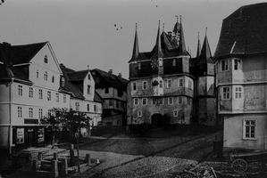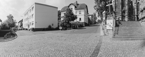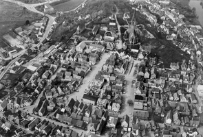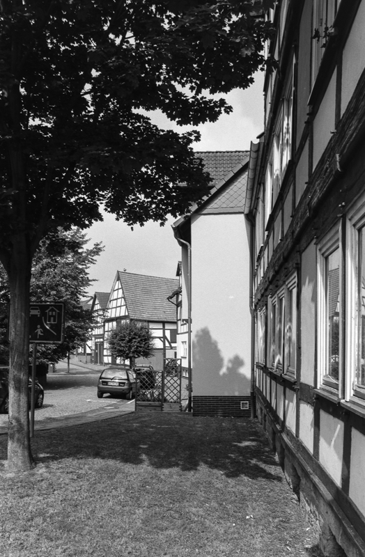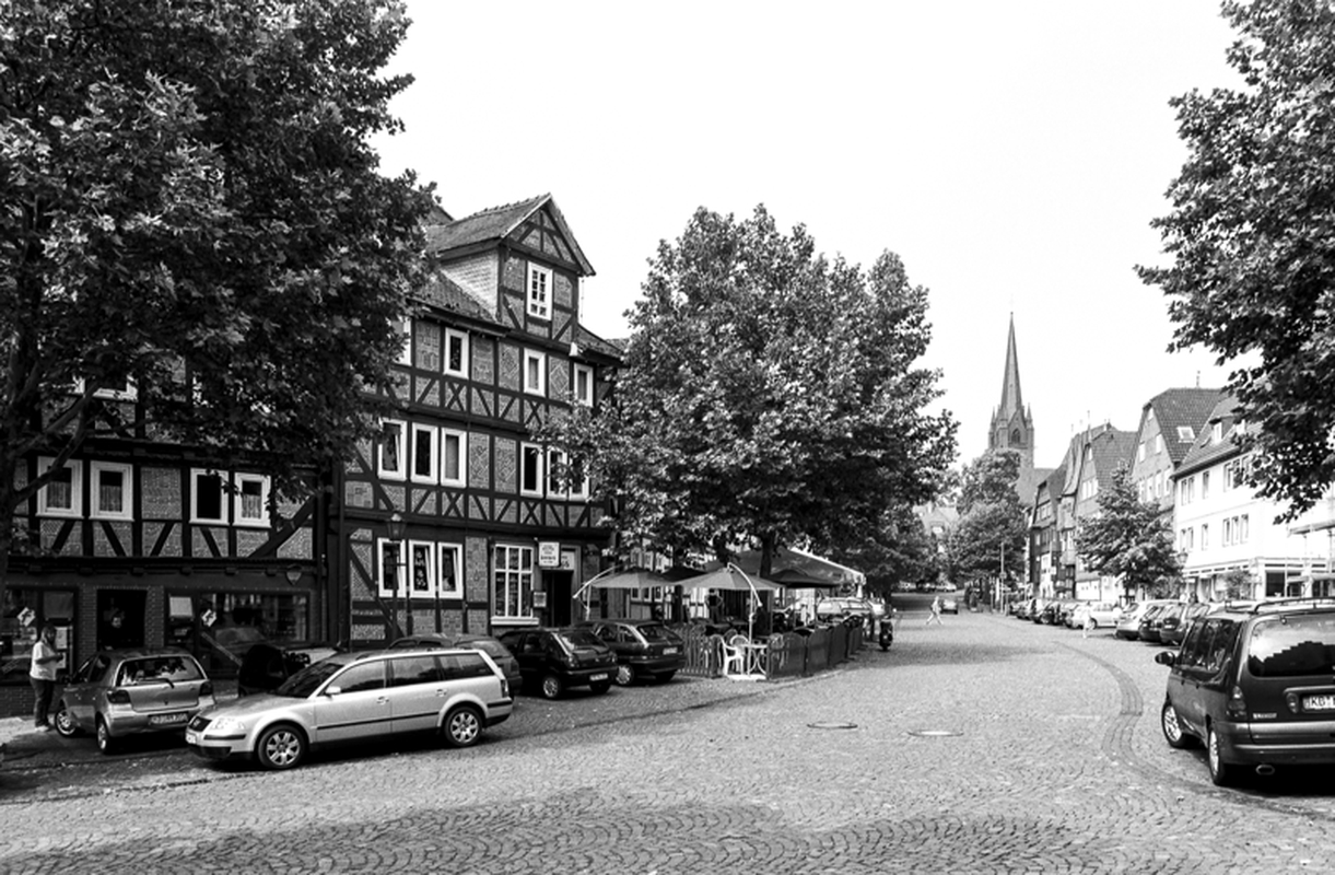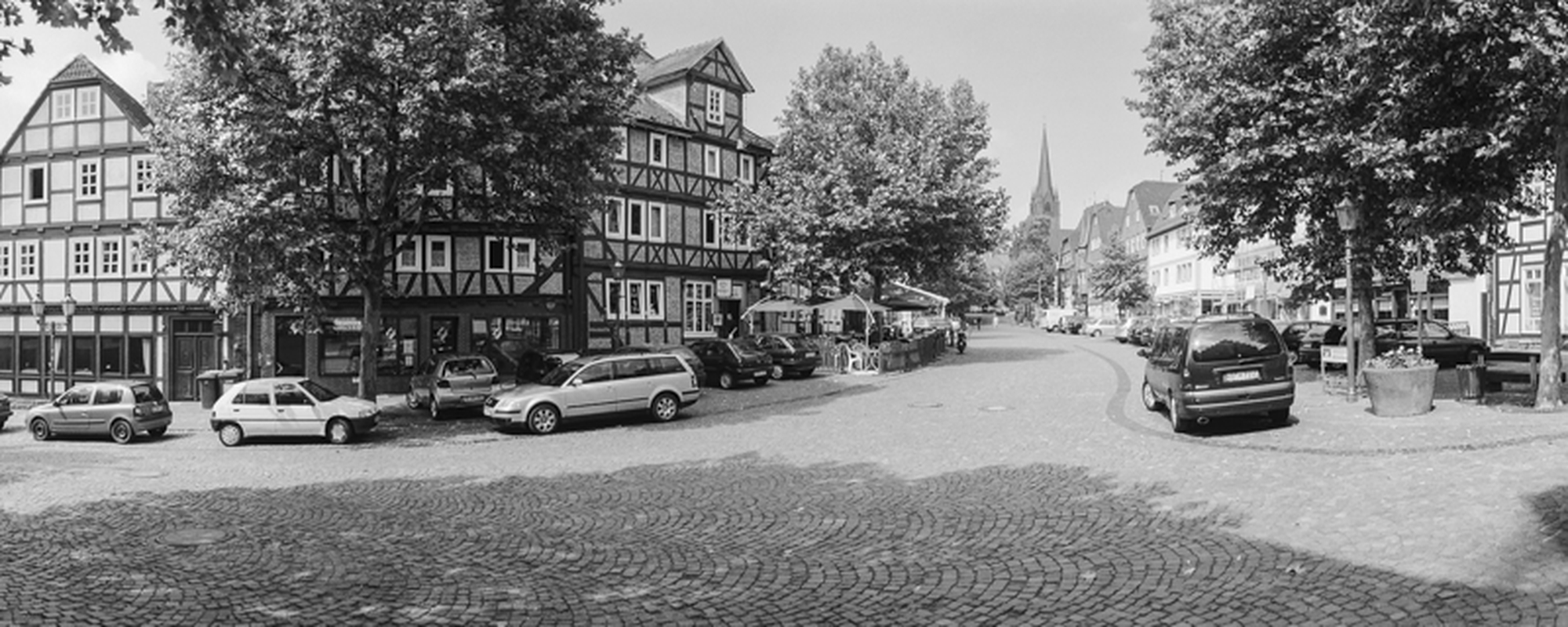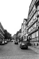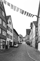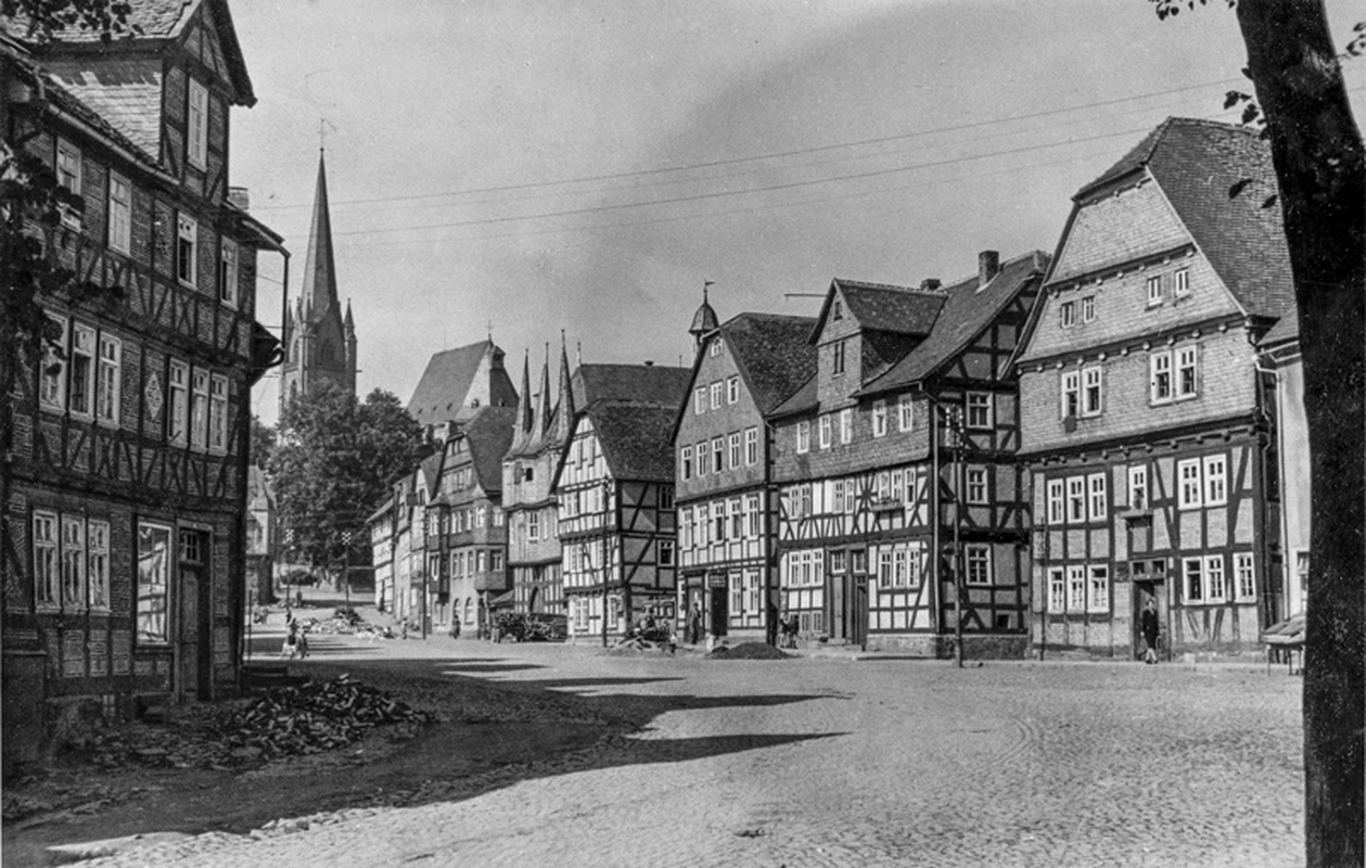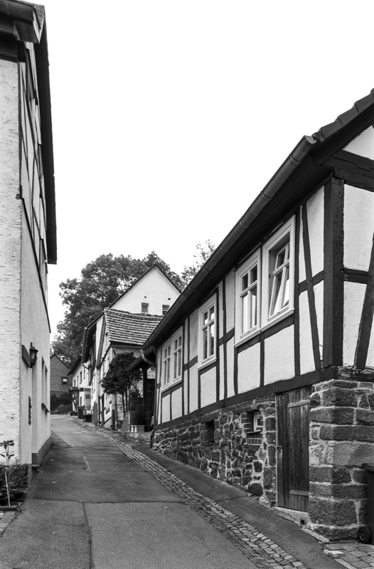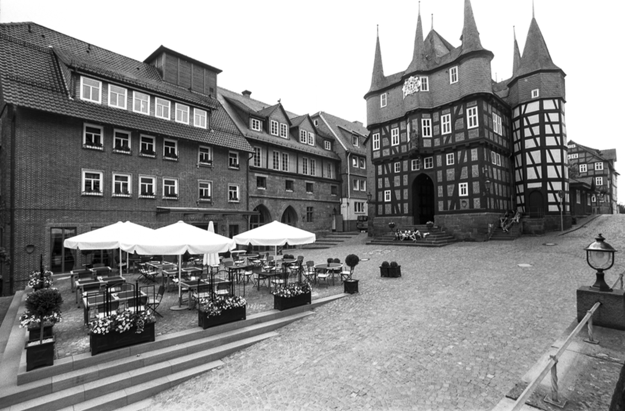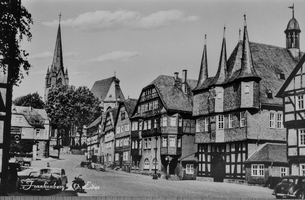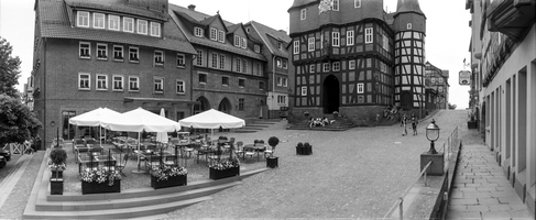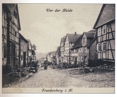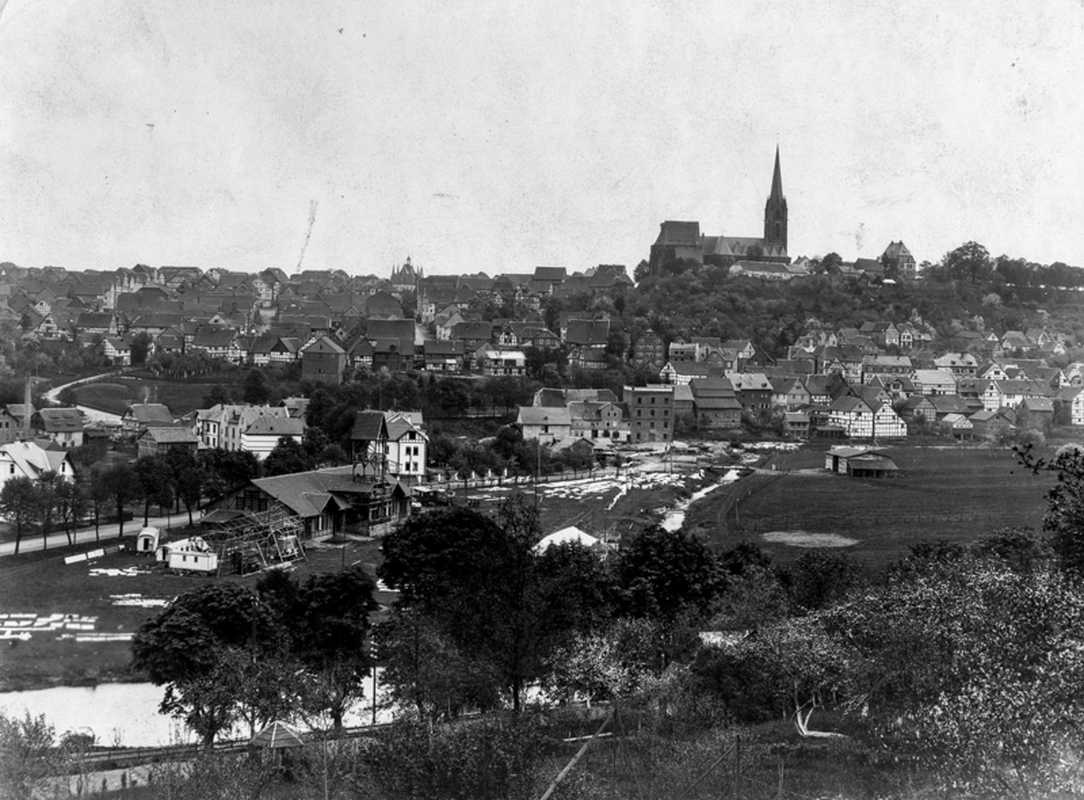 Kern und Ursprung der Stadt Frankenberg ist die Burganlage auf dem Felssporn des Burgberges. 1122 fiel diese Burg an die Landgrafen von Thüringen, die von hier ausgehend versuchten, einen eigenen Herrschaftsbezirk aufzubauen. Daher gründeten sie auf Battenberger Gebiet östlich der Burg im frühen 13. Jahrhundert die 1236 erstmals urkundlich erwähnte Siedlung Frankenberg. Diese wuchs in den folgenden Jahren schnell zu einer Stadt heran. 1248 entstand westlich vor der Stadt das Zisterzienserinnenkloster Georgenberg, im folgenden Jahr ist eine erste Brücke über die Eder bezeugt und 1255 verfügte Frankenberg schon über ein Rathaus. 1262 sind große Teile der späteren Stadtmauer bereits vorhanden, 1267 erhält die Stadt ein Wochen- und Jahrmarktprivileg und ab 1286 wurde die Liebfrauenkirche direkt unterhalb der Burg errichtet.Die Altstadt zeigt drei sich nach Osten aneinander reihende Siedlungskerne. Den westlichsten Punkt bildet die auf dem Bergsporn gelegene Burg, an die sich östlich die Kirche und später das Hospital anschließen. Den gesamten Rest der Berglehne bis hinunter in das Edertal bildet der bis 1288 ummauerte bürgerliche Wohnbezirk. Dem in unterschiedliche Richtungen abschüssigen Baugelände folgend wurde ein bis heute weitgehend unverändertes Straßensystem angelegt, das von zwei sehr breiten sich über 180 m von West nach Ost erstreckenden Marktstraßen abzweigt. Den Mittelpunkt bildet der nördliche Rathausvorplatz, an dem die Weinstraße (Steingasse) vorbeiführt. Parallel zu den beiden Märkten wurde im weniger steilen Süden die heutige Untergasse als relativ breite Straße, die vermutlich auch teilweise Marktfunktionen mit übernahm, trassiert. Nördlich des Untermarktes erschließen vier unterschiedlich steil abfallende Gassen den zur Eder gelegenen unteren Teil der Stadt mit der heutigen Dellbrücke und der Ritterstraße. Die östlichste dieser Gassen (Steubergasse, Pferdemarkt, Linnertorstraße) bildet von Anfang an einen breiten auch als Markt genutzten Riegel, der quer zu den beiden Märkten liegt und die Möglichkeit zur Querung der Stadt vom Linnertor zum Geismarer Tor bietet. Eine weitere Querachse (Auf der Heide) schließt die Stadt nach Osten ab. Östlich dieser breiten Trasse schließen sich nur noch Gärten an, die bis zur Stadtmauer reichten.Die prosperierende Altstadt wurde im Jahre 1476 Opfer eines Stadtbrandes, bei dem bis auf das Steinhaus (Pferdmarkt 20) und Teile der Kirche die gesamte Stadt vernichtet wurde. Wie Gerstenberg in seiner Stadtchronik niederschrieb „da herhub sich leyder eyn gruslich fur in der Mittelgassin, (..) an dem orthuse wan man in die Smiddegassen geen wil. Unde wywole vor keyn wynt enwas, sunder eyn gantz stille heiss tag, ydoch herhub sich der wynt von der Edern herane unde furte das fur uff die anderen husser zu der kirchin wert, so das die stad an vilen enden aneginck. (...) Nu hatte das fur gantz obbirnhant genummen unde brante in allen gassen, so das die husse zusammenvilen in die strasse, das nymants mee gewandern noch gelesschin enkonde. Da kam das fur auch an das raithuss. In demselbin husse hatte die stad ire bussen, pulver, armbruste (...) Unde als das fur darane quam, da gingen sie alle loiss, die kleynen mit den groissen. Derselbin groissin eyne die schoss widder das Steynen huss bei dem Groissin borne unde schoss die mure tzusschin tzween crutzefenstern entzwey. Alsus nam die stad grossin verderplichin schaden uff dem raithusse, (..). Dar quam das fur vorterss, unde nam meistenteil alle gassen in der aldenstad vor.Bynamen verbrante die Mittelgasse, die Stoubegasse. Die Rittergasse, die Asschergasse, die Smiddegasse, die Steyngasse, der Leckerberg, der Paffinberg, der Hinderberg, die Roddenergasse eynteil, der burckberg, der Hepenberg, das Martt, dy Huntgasse die Tichgasse, die Undergasse, die Lynnergasse eynteil, die Hindergasse, unde der Heyde eynteilss na der Geissmarporten wert." Dieser Rückschlag verstärkte die Tendenz des durch die Verlegung der Handelswege schon zuvor zurückgehenden Handels in einem Maße, dass sich die Stadt bis in das späte 19. Jahrhundert nicht mehr davon erholte. Schon für den Wiederaufbau im frühen 16. Jahrhundert waren umfangreiche Zuschüsse aus einer Landeskollekte nötig. Viele private Bauherren waren vollständig verarmt, so dass noch im späten 18. Jahrhundert an einigen Stellen in der Stadt Baulücken bestanden. Noch in der zweiten Hälfte des 19. Jahrhunderts bot die Stadt aufgrund der wirtschaftlichen Stagnation sowie des geringen Bevölkerungs- und Baudruckes genügend Bauflächen innerhalb der Mauern. Allein diesem Umstand ist es zu verdanken, dass sich die Altstadt Frankenbergs heute als nahezu geschlossenes Fachwerkensemble mit Gebäuden aus der Zeit des frühen 16. bis späten 19. Jahrhunderts zeigt.Die ältesten, kurz nach 1500 entstandenen Fachwerkhäuser weisen noch deutlich die Tradition der mittelalterlichen Ständer- oder Geschossbauweise auf. Zwar wurde das seit 1509 errichtete Rathaus als seinerzeit moderner Stockwerksbau verzimmert, doch zeigen andere Häuser noch fast vollständige Ständerbauweise, die lediglich an den Straßenfassaden durch „Scheinstockwerke" ein moderneres Gepräge erhielten. Der sich bald im 16. Jahrhundert durchsetzende giebelständige Stockwerksbau mit hohen Erdgeschossen, Geschossüberkragungen und Mannfiguren als Zier- und Aussteifungsformen wurde in der Stadt sehr lange gepflegt. Noch zu Beginn des 19. Jahrhunderts findet man Vertreter dieses Baustils an vielen Stellen der Altstadt. Seit dem frühen 18. Jahrhundert gesellen sich aber zunehmend traufständige Fachwerkhäuser mit einfacherer Gefügekonstruktion und Zwerchhäusern dazu, die dann im Laufe des 19. Jahrhunderts prägend werden. Ein besonderes Merkmal des Fachwerks in Frankenberg sind die zumeist im 16. Jahrhundert ausgeführten Zierausmauerungen der Gefache mit flachen Ziegeln und eine Vielzahl noch heute erhaltener zweigeschossiger Eckerker, die Kreuzungen 