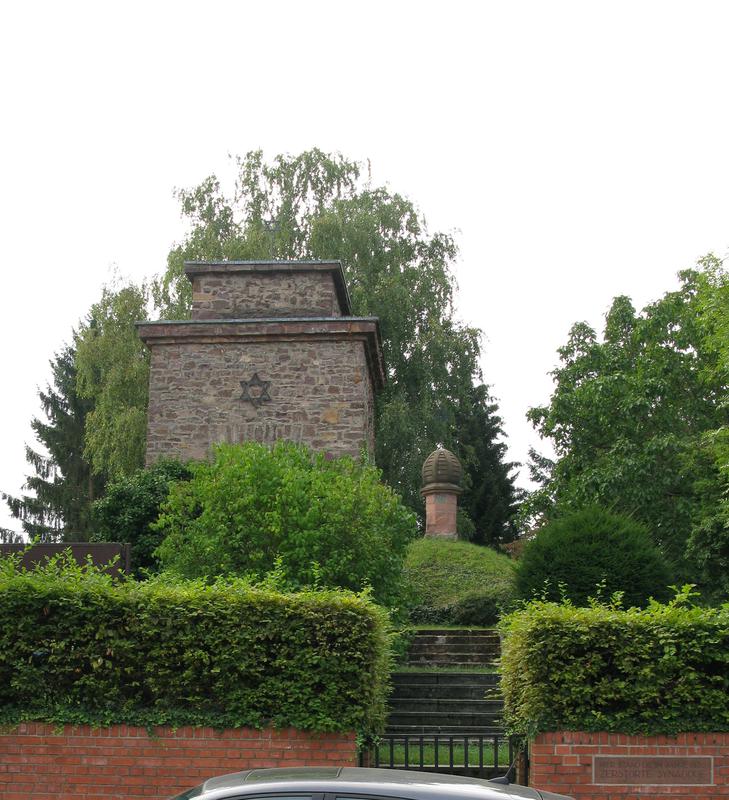 Mahnmal aufgebaut 1946 aus den baulichen Resten der an diesem Ort zerstörten Synagoge. Unter dem Mahnmal das rituelle Tauchbad, deren Reste ab 1995 freigelegt, gesäubert und trockengelegt wurden. Mit einer eigenen, gemauerten schmalen Außentreppe zugänglich, die Türöffnung unmittelbar am Tauchbecken gelegen, daher wohl der ursprüngliche Eingang an der gegenüber liegenden Wand. Fußboden etwa 2,6m unter der Erde, Grundfläche 3x4m. Das Tauchbecken, 1,5x0,7m mit einer Tiefe von 1,2m, liegt quer zum Abstieg und endet mit seiner Stirnseite an einer vom Fußboden gesehen niedrigeren Wand, deren Abschluss ein mit Rille ausgeführter Sandstein bildet und darüber zwei gebogene Wasserrohre aus der Wand besitzt. Die beiden Rohre führten wohl das erwärmte zusätzliche Wasser vom Kessel in das Becken, zumal in der Fortsetzung des Tauchbeckens ein Schornstein an der Längsseite des Raumes vorgefunden wurde. Das Mahnmal ist Kulturdenkmal aus religions- und ortsgeschichtlichen Gründen.