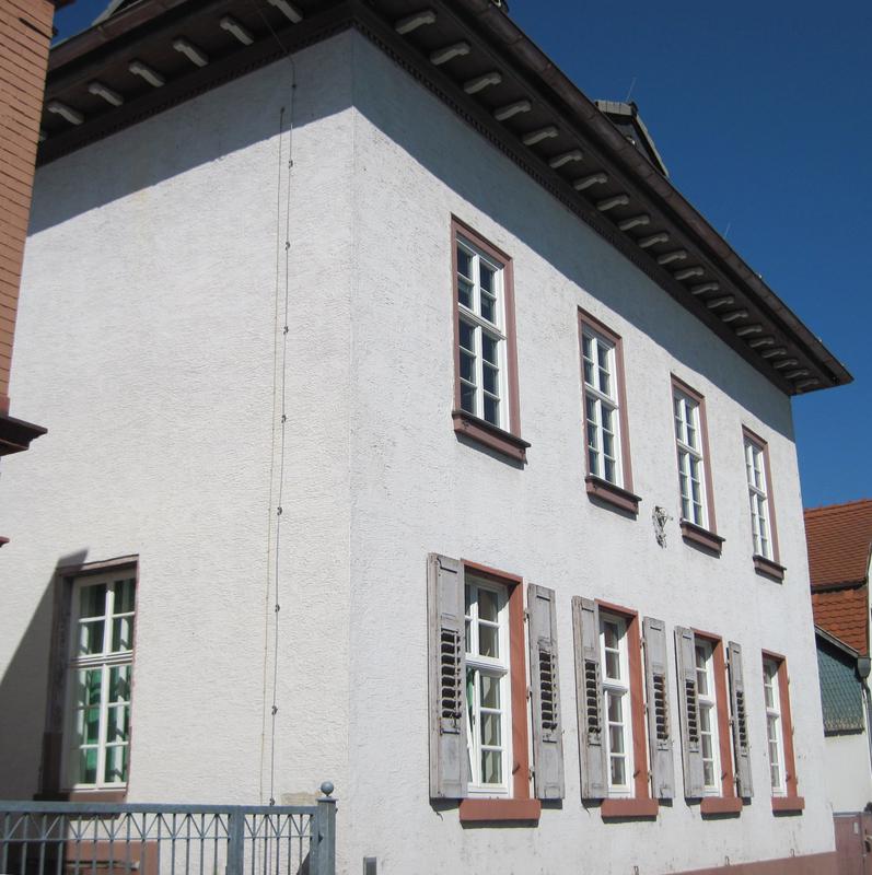 Auf nahezu quadratischer Grundfläche wurde in den zwanziger Jahren des 19. Jhs ein großvolumiges, massives, zweigeschossiges Wohnhaus mit schiefergedecktem Zeltdach in klassizistischer Formensprache errichtet; wahrscheinlich aus dem Abbruchmaterial des Steinweger Torturms (1820 auf Abbruch versteigert). Über einem Sandsteinsockel entwickelt sich die symmetrische, vierachsige Fassade mit großformatigen Fenstern in Sandsteingewänden, im EG mit Klappläden ausgestattet; leider ist das Gurtgesims zwischen EG und OG verloren gegangen. Das ausgebaute Dach auf moderatem Kniestock wird belichtet über je drei Giebelgauben nach Osten und Süden, einer mittigen, größeren, mit paarigen Fenstern und zwei kleinen seitlich angeordneten Gauben. Der ausladende Traufkasten ist mit einem umlaufenden Stichbalkenkranz versehen. Das Gebäude ist aufgrund seiner Dominanz im Straßenraum sowie seiner für Dieburg außergewöhnlichen Architektursprache Kulturdenkmal.