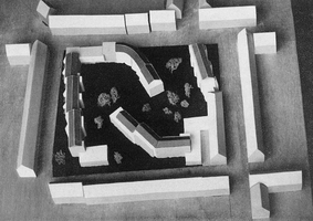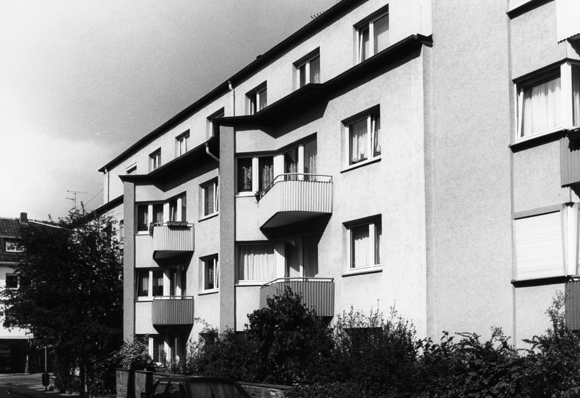 Vier- bis fünfgeschossige Wohnanlage mit 88 Wohnungen von Otto Bartning und Otto Dörzbach; ausgeführt 1955-56. Bemerkenswert die Anordnung der Baukörper auf dem Grundstück: Staffelung, Krümmung und Parallelverschiebung der Gebäude schaffen eine durchlaufende Grünfläche ("Grüne Oase"). Dem entspricht die architektonische Gestaltung der Fassaden mit großzügig gestaffelten, nicht einsehbaren Balkons zum Blockinneren.