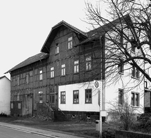 Die großvolumige Anlage stammt aus dem späten 19. Jahrhundert. Der Wohntrakt befindet sich im südwestlichen Teil, daran schließen nach Nordosten Scheune und Stall an. Das Wohnhaus steht mit zwei Fachwerkgeschossen auf einem Sandsteinsockel, dreifach verriegelte geschosshohe Streben verstärken die Konstruktion. Erschließung durch einen Ern mit einläufiger Außentreppe. Der Wirtschaftsteil geht über einem niedrigen Sandsteinsockel auf, darüber ein gemauertes Sockelgeschoss mit Fachwerk im oberen Teil.