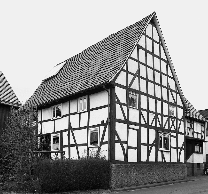 Im Kreuzungsbereich Steinweg/Unter der Linde aufgestellter zweigeschossiger Ständerbau aus dem späten 17. Jahrhundert, zugehörige Scheune von 1883. Das ehemalige Einhaus bestand aus einem Wohnbereich im Osten und dem Wirtschaftstrakt im Westen. Die Konstruktion erhebt sich über einem Sandsteinsockel, Ständerfachwerk mit teilweise sehr kräftigen Hölzern, die auffallend weit auseinander gestellt sind. An Bund- und Eckständern über zwei Geschosse reichende divergierende Dreiviertelstreben.