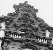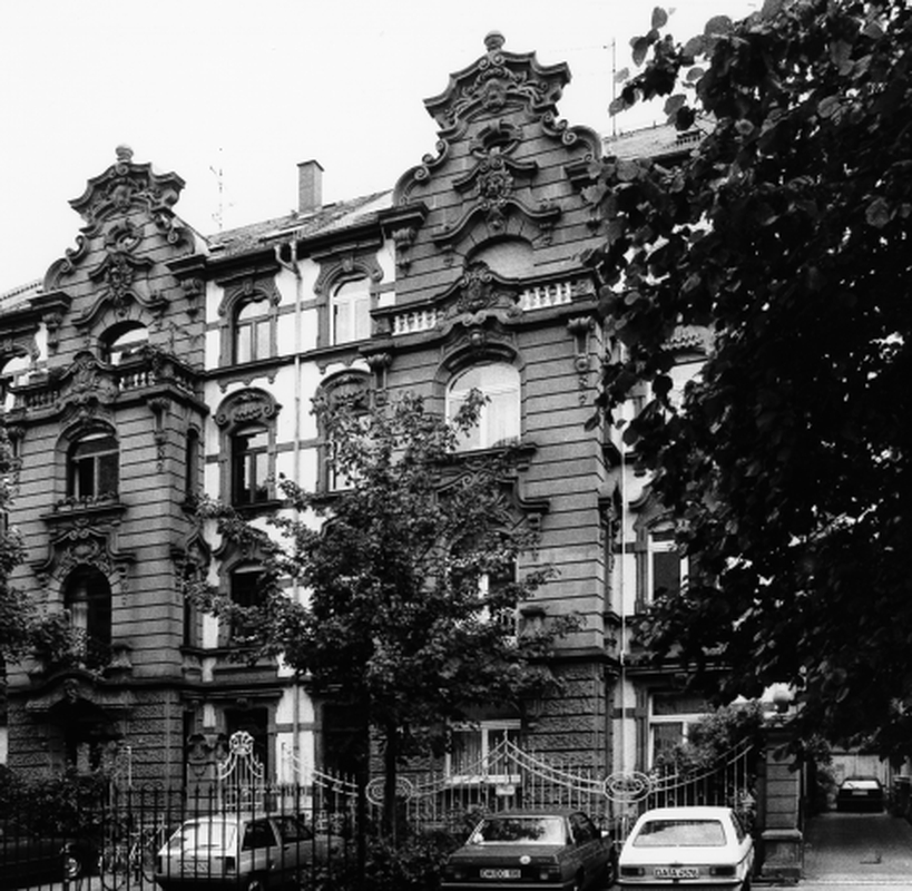 Baugleiche neubarocke Hausgruppe des Darmstädter Baumeisters Christoph Simon aus dem Jahr 1902. Aufwendige, vorwiegend in Sandstein gehaltene Fassade mit plastischem und bewegtem barockisierenden Dekor. Repräsentativer gebänderter, die aufstrebende Mitte betonender Risalitvorbau mit flach vorgelegtem Zierbalkon in der Beletage und abschließendem Balusterbalkon im dritten Obergeschoß. Darüber plastisch belebter Zwerchhausgiebel in üppigem Formenaufwand. Aus der Entstehungszeit erhalten die barokken Eingangstüren mit vergitterter Glasfüllung und die dekorativ geschwungene Einfriedung. Hohe handwerkliche Qualität der in Werkstein ausgeführten neubarocken Stilelemente und der daraus resultierenden überragenden Wirkung im Stadtbild.
