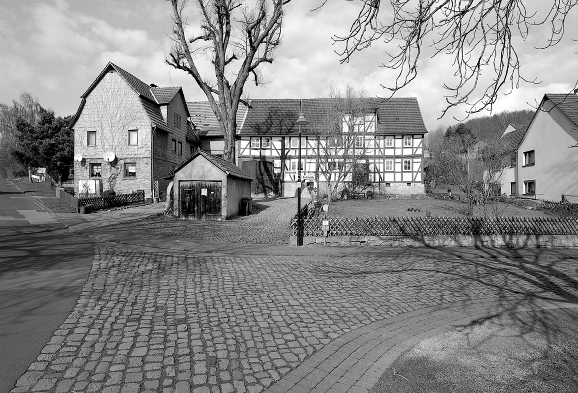 Leicht erhöht und weit zurückversetzt steht der Streckhof aus dem späten 18. Jahrhundert. Das Einhaus wurde in Rähmbauweise auf einem hohen Sandsteinsockel errichtet. Das Eichenfachwerkgefüge ist im Erd- und Obergeschoss zweifach verriegelt und wird durch Dreiviertelstreben an Bund- und Eckständern ausgesteift. Traufseitig profilierter Geschossüberstand. Das Satteldach des Zwerchhauses wurde zu einem Pultdach umgebaut. Unterhalb des Zwerchhauses befindet sich der Eingangsbereich mit einläufiger Vortreppe. Das angrenzende Scheunengebäude entspricht im Fachwerkgefüge und in den Schmuckformen dem Einhaus.