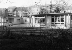 Der Wiener Architekt Franz Schuster stellte 1951 in der Abteilung "Meisterbauten" der Ausstellung "Mensch und Raum" seinen Entwurf für einen Kindergarten mit Hort und Krippe vor. In veränderter Form wurde die Gruppe an anderem Ort in zwei Bauabschnitten 1953 und 1955/56 zusammen mit dem Hochbauamt realisiert. Schusters neuer Entwurf bleibt bei der ursprünglichen Dreigliederung; auch zeittypische Elemente wie vorkragende Flachdächer, filigrane Stützen und große, unterteilte Fenster werden beibehalten.