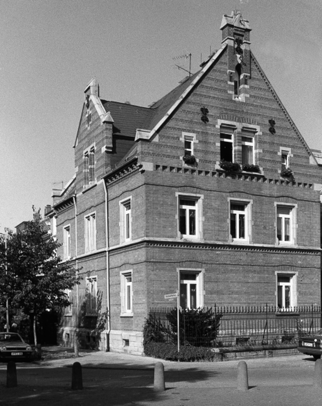 Die ehemalige "Gendarmeriekaserne" am Schloßgartenplatz bestand aus einem Wohnhaus mit "Bureau des Gendarmerie-Corps" und einem Pferdestall. Erhalten ist das um 1885 als freistehendes Eckgebäude entstandene Dienstwohnungsgebäude. Die Fassadengestaltung besticht durch die malerisch farbige Materialwirkung der in orange und rot zart gebänderten Ziegelverblendung und der feinen, hellen Sandsteingliederung. Sparsamer Schmuck mit Ziegeldekorlagen und Zierankern. Qualitätvolle schmiedeeiserne Einfriedung mit Tor.
