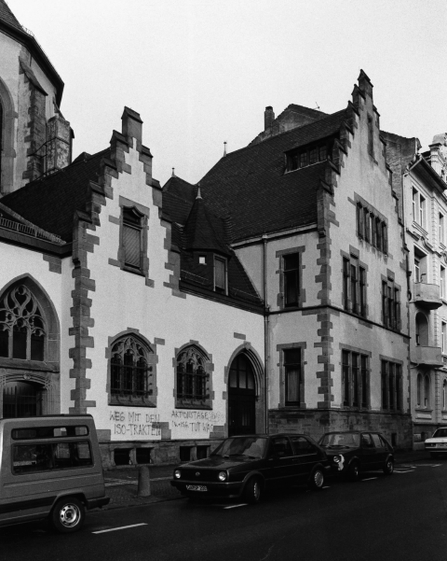 Zweigeschossiger, giebelständiger Baukörper, 1903-05 als anspruchsvolles Ensemble zusammen mit der Kirche St. Elisabeth in neugotischem Stil errichtet. Architekt war der Mainzer Dombaumeister Ludwig Becker. Schmale, zweiachsige Fassade in Putz mit dekorativ in Sandstein abgesetzten Elementen. Ein bekrönender Treppengiebel verbirgt das steile Dach. Das Gebäude ist durch einen niedrigeren, in den Fenstern reich gestalteten Zwischentrakt mit der Kirche verbunden.