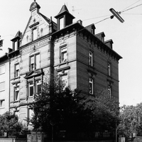 Blockhafter dreigeschossiger Klinkerbau von 1896 in dominierender Ecksituation. Hauptfassade zur Heinheimer Straße durch übergiebelten Mittelrisalit hervorgehoben. Reicher Fassadenschmuck in der der gründerzeitlichen Klinkerarchitektur eigenen Formensprache. Ausführung der Ornamente, Rahmungen und horizontalen Bänder in kontrastfarbenem Klinker und Sandstein. Einfriedung und Haustür mit schmiedeeisernem Gitterwerk erhalten.