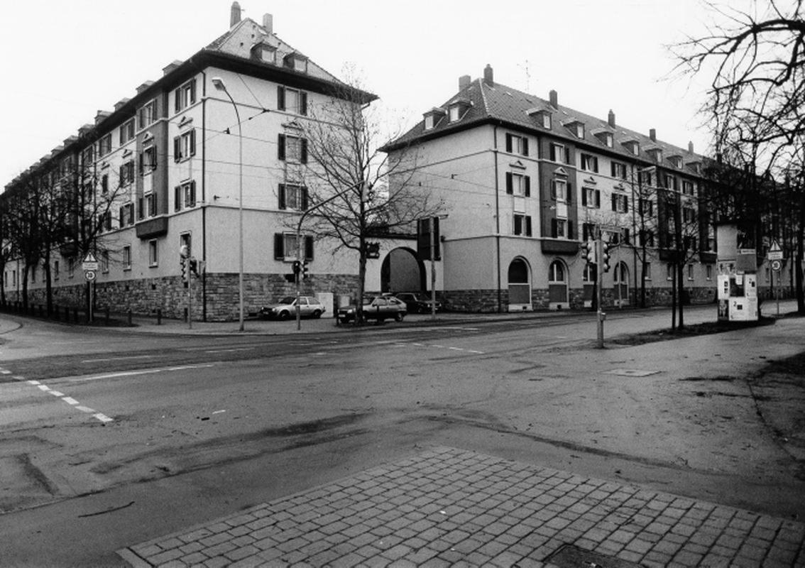 Zwei langgestreckte, viergeschossige Wohnblocks von 1928/29 - Teil eines städtischen Wohnungsbauprogramms zur Behebung existentieller Wohnungsnot in der Nachkriegszeit. Entwurf vom Stadtbauamt unter August Buxbaum und Georg Hoffmann. Die über Eck gestellten Bauten sind ein typisches Beispiel für die traditionalistische Formensprache des öffentlichen Mietwohnungsbaus der Zwanziger Jahre in Darmstadt.