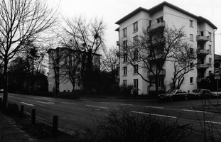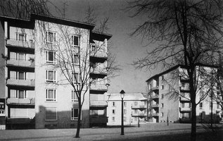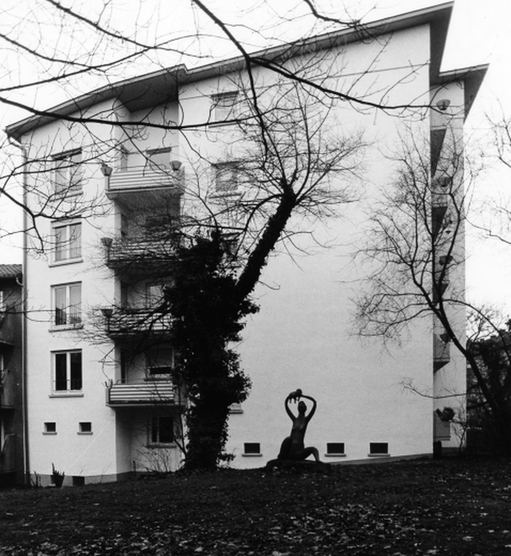 Zu den besonderen Details dieser gelungenen Sozialwohnungen gehören neben den nach Süden hin ansteigenden Dächern der beiden Punkthäuser vor allem die Fassadengestaltung mit den Balkonen und den dazugehörigen Asbestzementkübeln.
