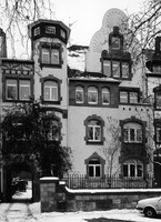 In Sandstein plastisch gegliedertes 3-geschossiges Wohnhaus mit glatter Putzfassade um 1900 von Harres & Barth. Schmückende Steinmetzarbeiten im Torbogen der Einfahrt als Säulen, im Frontispiz als Renaissanceschnecken mit Maske ausgebildet. Die bewegte Dachlandschaft mit Turmrisalit und zurückgesetztem Schweifgiebel unterstreicht den burgartigen Charakter des Hauses, nur überlagert vom jugendstiligen Putzdekor des Frontispiz. Erhalten die Werksteineinfriedung mit aufgesetzten schmiedeeisernen Gittern.