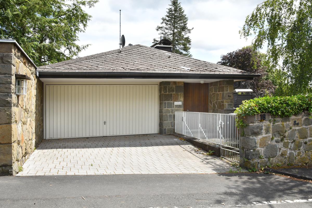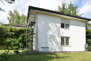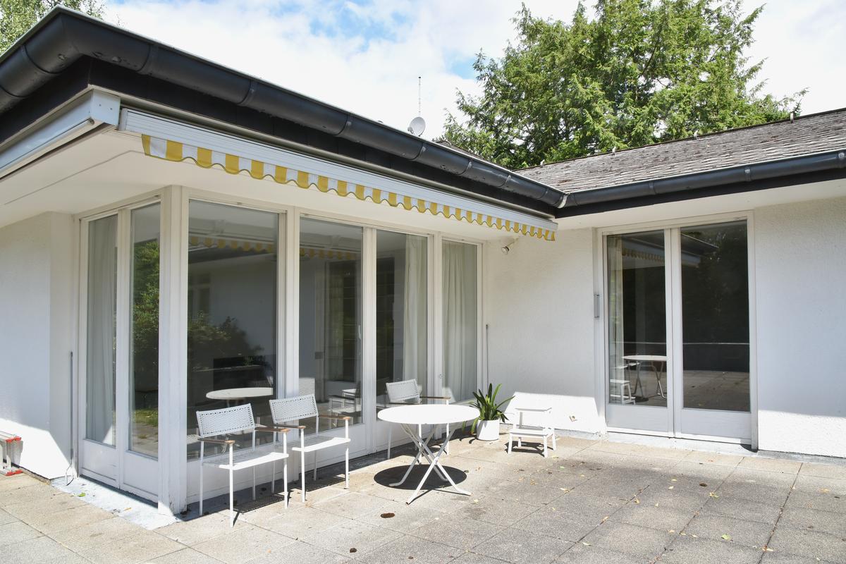 Straßenseitig befinden sich die Garage, der Hauseingang sowie der Zugang zum Garten. Über eine Treppe wird das darunter liegende Hauptgeschoss erschlossen. Die Hauptwohnräume (Wohn-, Schlaf-, Arbeitszimmer) sind nach Süden ausgerichtet und haben jeweils einen Zugang zur Terrasse sowie große Fensterflächen. Die Funktionsräume (Küche, Bad, Flur) sind auf der Nordseite angeordnet und mit schmalen, horizontalen Fensterbändern ausgestattet. Im Kellergeschoss liegen zum Garten hin ein Gäste- und Bedienstetenzimmer. Die restlichen, im Hang liegenden Räume bieten neben Technikräumen verschiedene Lagermöglichkeiten sowie eine Waschküche.