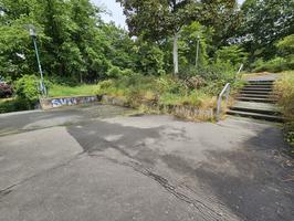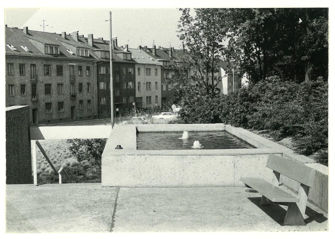 In der Umsetzung der Planung wurde 1961/62 die ehemals weiter westlich stehende Umfriedungsmauer des Gartens an der Klappacher Straße abgebrochen und die zurückversetzte Stützwand aus Beton mit Rampe als Haupteingang zum Park erstellt. Teil der Rückverlegung der Parkeinfriedung war die Errichtung einer Bedürfnisanstalt, für die der Darmstädter Architekt Rolf Prange verantwortlich zeichnete. Zunächst im Grzimekschen Gartenplan als „Wartehäuschen“ bezeichnet, umfasste die Maßnahme neben der notwendig gewordenen Betonstützmauer einen Treppenaufgang mit Aussichtspunkt am Treppenaustritt in den Park und einen Springbrunnen. Die Betonstützmauer ist mit großformatigen Waschbetonplatten verkleidet.