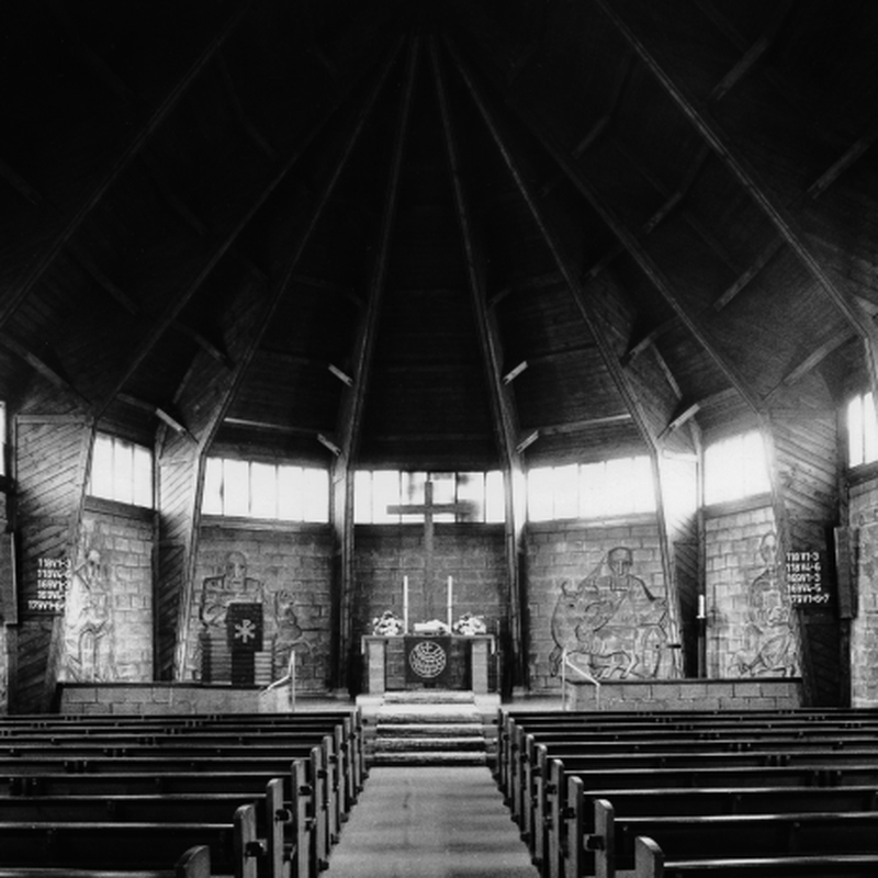 Die vorgefertigten Holzleimbinder für die Notkirchenkonstruktion wurden im Inneren mit dem für den Darmstädter Wiederaufbau typischen Trümmersplittstein ausgemauert. Der Trümmersplitt blieb unverputzt. Der Heidelberger Maler Will Sohl gestaltete die groben, grauen Wände mit biblischen Motiven in mit Eiweiß gebundener Temperafarbe.