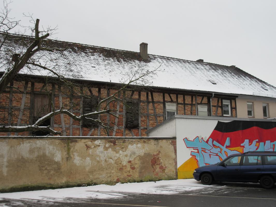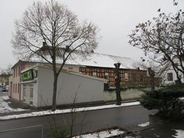 Das langgestreckte, senkrecht zur Straße angeordnete Gebäude stellt die restliche Bebauung einer in der 1. Hälfte des 19. Jhs errichteten, südlich der mittelalterlichen Altstadt vorgelagerten, hofartigen Anlage dar. Hier waren bis zu ihrem Abbruch zugunsten der Stadthalle eine öffentliche Wäschebleiche, das städtische Schlachthaus und ein Holzmagazin angeordnet. Der verbliebene südliche Flügel der Anlage zeigt in seinem westlichen, zur Straße gerichteten massiven, zweigeschossigen Teil ein Wohnhaus, dessen abgewalmtes Satteldach den im Obergeschoss aus Fachwerk gefügten östlichen Gebäudetrakt mit überdeckt. In der weiteren Folge schließt östlich ein L-förmiger Stall- und Scheunentrakt an, der ebenfalls aus Sandstein-Bruchsteinmauerwerk sowie einem Fachwerkobergeschoss gefügt ist. Das Gebäude bildet städtebaulich einen wichtigen Abschluss der Freifläche der Stadthalle nach Süden sowie eine wichtige Raumkante der Bürgermeister-Rühl-Straße (im weiteren Verlauf Harreshäuser Allee) nach Norden, so dass ein Erhalt aus städtebaulichen Gründen aber auch geschichtlichen Gründen geboten ist.