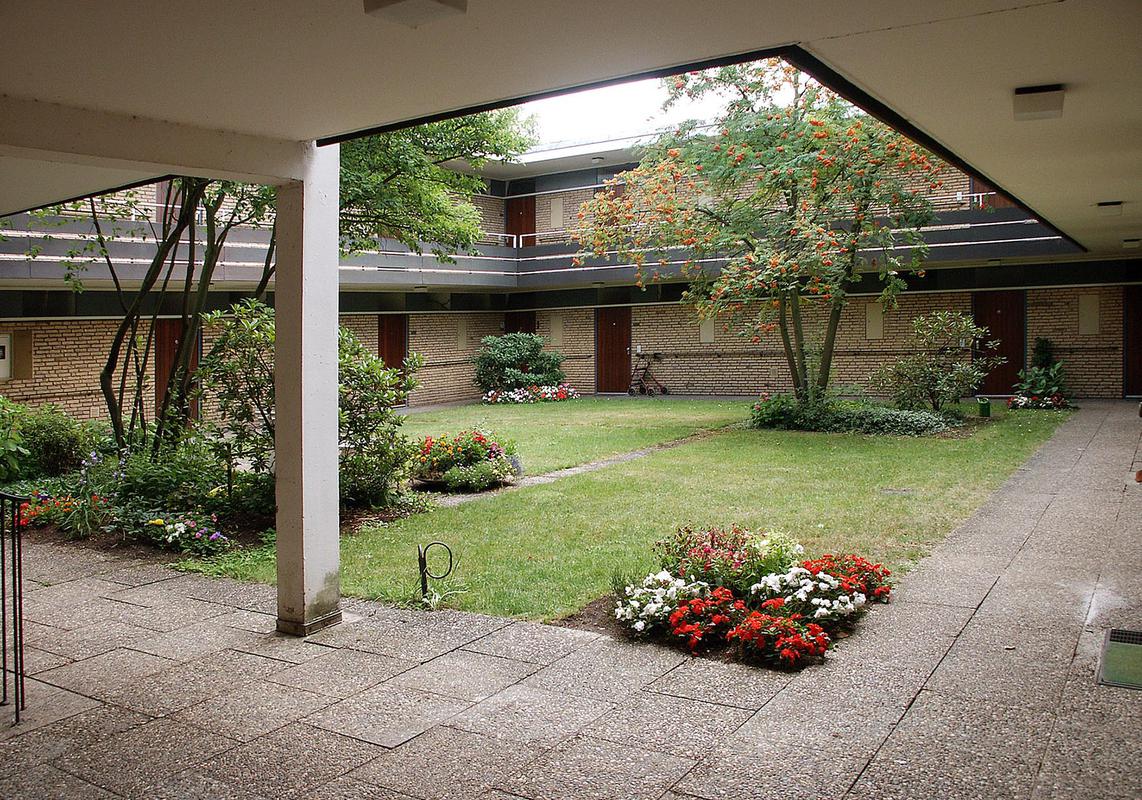 Die Neubauten wurden als Geschoss-Wohnungsbau und in Anlehnung an die für Einfamilienhäuser dieser Zeit typische zurückhaltende Bungalowarchitektur mit Flachdach und Panoramaverglasung errichtet. Als Atriumhäuser umschließen die Gebäude je einen begrünten Innenhof, von dem die Wohnungen über Treppenanlagen bzw. Aufzüge und umlaufende Laubengänge separat erschlossen werden und somit die Wohnqualität durch den Charakter der Einfamilienwohnung entscheidend bereichert. Die Häuser zeigen daher in der Fassadengliederung den kennzeichnenden Kontrast zwischen den sich zur Grünanlage in großflächigen Fenstern öffnenden „Außenfassaden" und den aufgrund der Erschließungsfunktion der Innenhöfe weitgehend geschlossenen Innenhoffassaden.