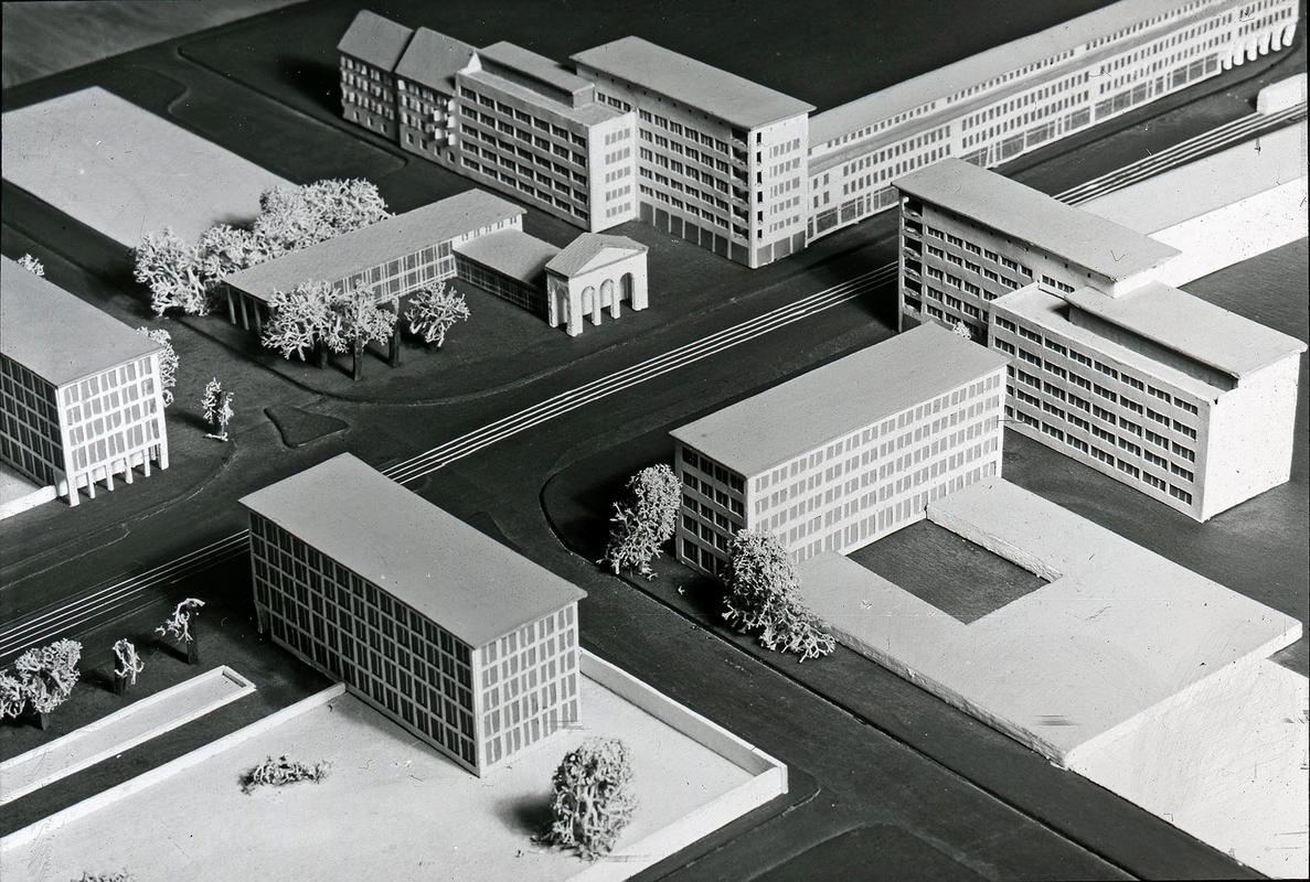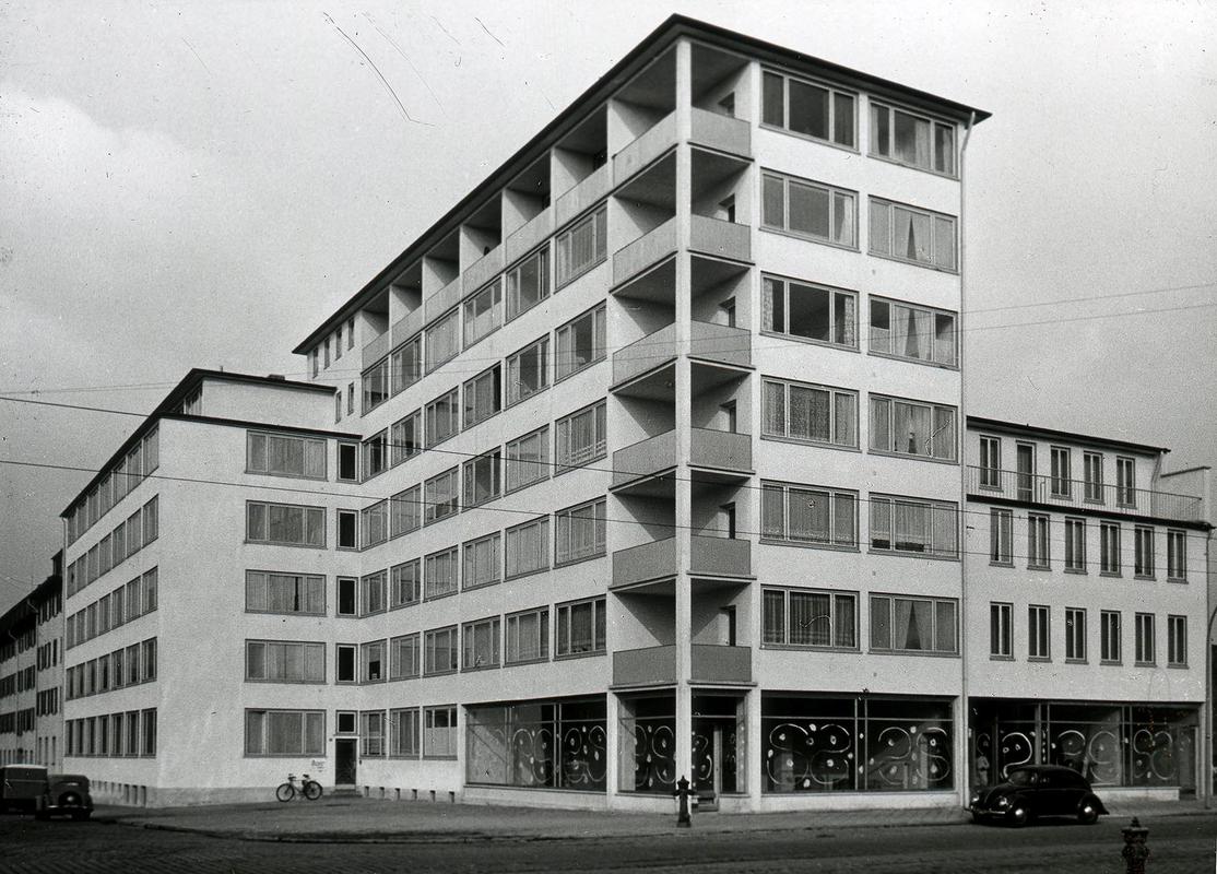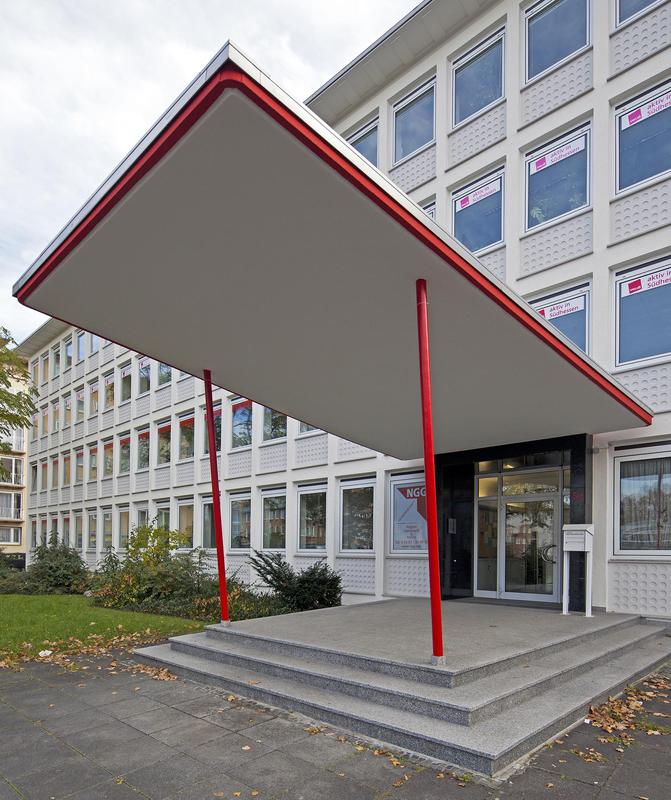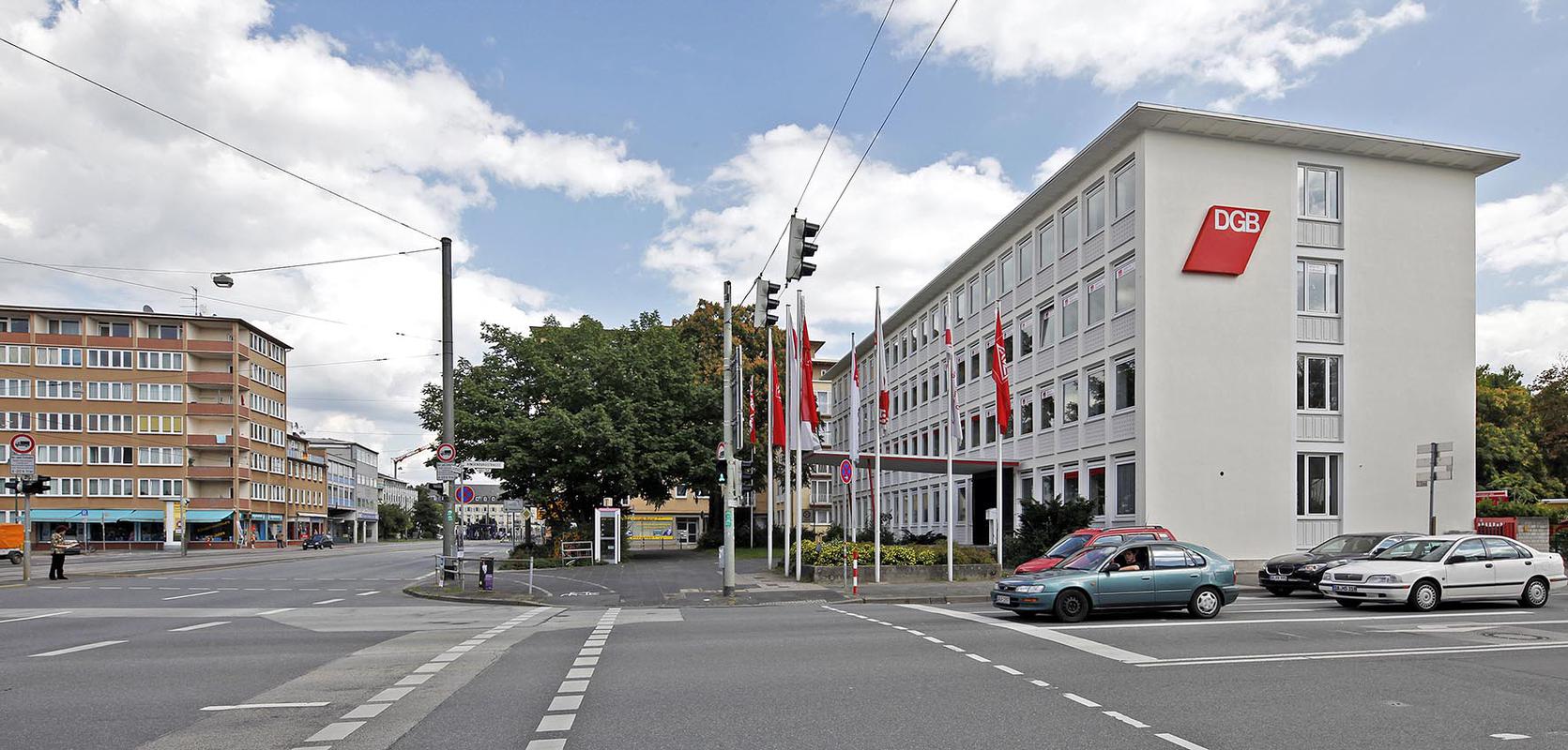 Die Gebäude selbst weisen alle regelmäßige Lochfassaden der 1950er Jahre Architektur auf. Typisches Kennzeichen dieser Architektur ist der mit einem Flugdach auf zwei dünnen Stahlstützen hervorgehobene asymmetrisch gelegene Haupteingang des Gewerkschaftshauses, erbaut 1952/53 nach Plänen von Karl Schäfer und Georg Heinrich Besier.
