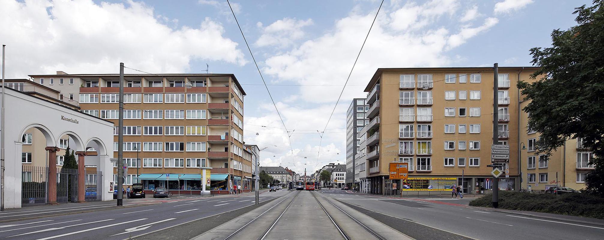 Einer dieser Plätze ist der Steubenplatz, der durch orthogonal gestellte Gebäude mit Flachdach gefasst wird. Von Westen kommend bilden zwei quer zur Rheinstraße stehende fünfgeschossige Bürogebäude das erste Tor zur Innenstadt. Danach öffnet sich der Platz, begrenzt im Süden von dem zurückstehenden viergeschossigen Gewerkschaftshaus und im Norden von der zweigeschossigen Kunsthalle, erbaut 1956 von Theo Pabst im Stil der klassischen Moderne. Davor sind als Erinnerung an das ehemalige Rheintor zwei klassizistische Sandsteinsäulen (Georg Moller) erhalten. Der östliche Platzabschluss mit zwei fünf- bis siebengeschossigen Wohnhausriegeln verengt den Durchlass in die Stadt und formt auf diese Weise ein kraftvolles modernes Stadttor an der Stelle der ehemaligen Stadtgrenze der „Mollerstadt“, das trotz des stark flutenden Verkehrs auch heute noch seine geplante Wirkung entfaltet.