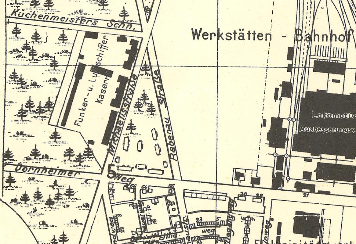 Zu den wenigen gut erhaltenen Kasernenbauten zählt die ehemalige Luftschiffer- und Funkerkaserne an der Michaelisstraße. Der Kasernenkomplex, der 1914 im ersten Kriegsjahr nach Plänen der Architekten Simon und Kolb errichtet wurde, diente den Mannschaften der damals neuen Truppengattungen als Unterkunft. Nach dem Ersten Weltkrieg, als gemäß den Auflagen des Versailler Vertrags sämtliche Kriegseinrichtungen Deutschlands zerstört oder außer Betrieb genommen wurden, konnten die beiden großen Mannschaftsgebäude zu Wohnungen für Reichsbahn-Bedienstete umgebaut werden. Die zur Kaserne gehörigen Verwaltungs-, Kammer- und Stallgebäude blieben erhalten.