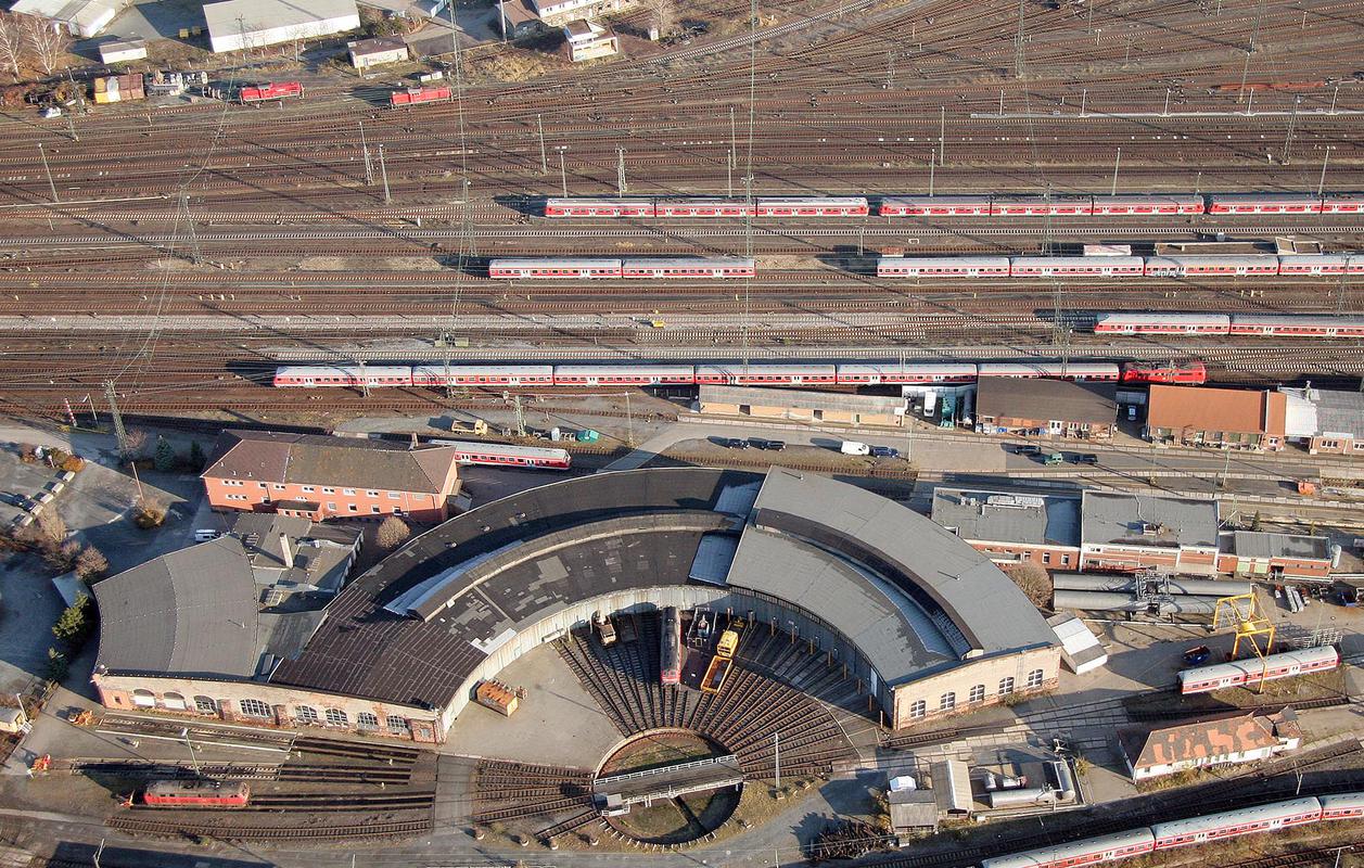 Nördlich des Hauptbahnhofs westlich der Hauptfahrgleise und von ihnen abgewandt steht eine offene Zwillingsanlage von 1912 aus ehemals zwei annähernd symmetrisch angelegten Ringschuppen (ursprünglich 9- und 23-ständig für kleinere bzw. große Lokomotiven). Während der nördliche nur als Torso erhalten ist, ist der zweiteilige südliche mit 14 niedrigeren und 9 höheren Ständen zusammen mit der Drehscheibe noch funktionsfähig. Architekt war vermutlich der Mainzer Regierungs- und Baurat bei der Eisenbahndirektion in Mainz, Friedrich Mettegang (1854-1913), der als Eisenbahn-Baubeamter die meisten technischen Zweckbauten im Zuge des Hauptbahnhofneubaus geplant hat und dabei auf eine künstlerisch geschmackvolle Ausstattung Wert legte.