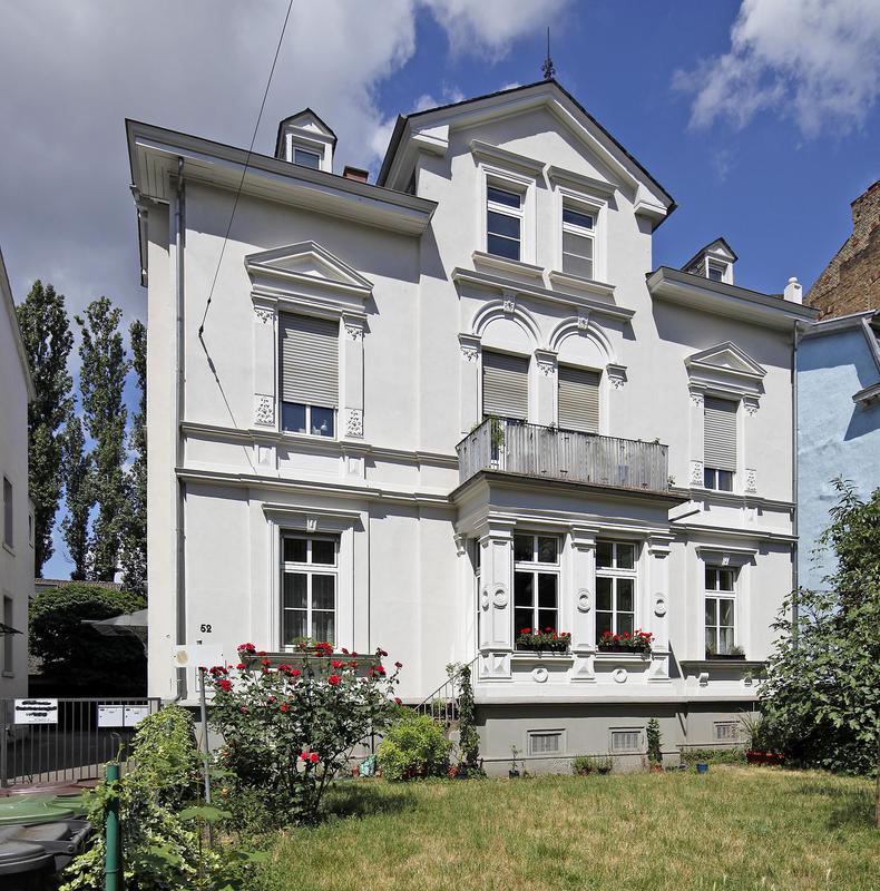 Die Frankfurter Straße zwischen Kahlertstraße und Röhnring wurde größtenteils im letzten Jahrzehnt des 19. Jahrhunderts mit Mietwohngebäuden bebaut. Aus dieser Zeit stammt auch das Haus Nr. 52. Das zweigeschossige blockhafte Gebäude mit Satteldach und Quergiebel weist eine klar gestaltete straßenseitige Fassade auf, die mit Stilelementen der Neo-Renaissance geschmückt ist. Durch einen ausgeprägten Sockel und zwei Gurte zwischen Erd- und Obergeschoss erhält die Fassade eine horizontale Betonung, die ein Gegengewicht in einem flachen Mittelrisalit des Quergiebels und dem einen Balkon tragenden erdgeschossigen Vorbau findet. Die Fassadenflächen der Beletage sind durch üppig gerahmte Fenster mit Gebälk, Tympanon, Rundbögen und Pilastern gestalterisch gegenüber dem Erdgeschoss hervorgehoben.