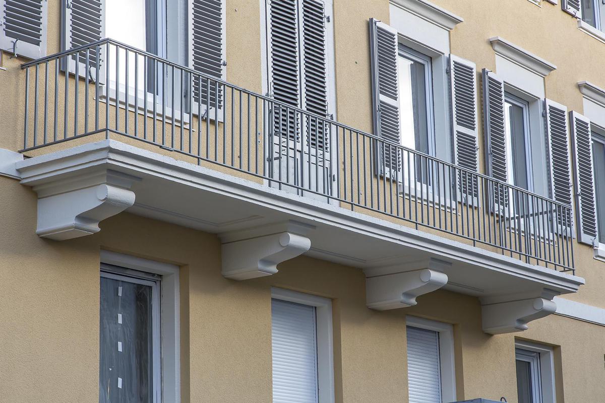 Sämtliche Fenster der Obergeschosse sind einfach und zugleich breit gerahmt, lediglich die Fenster des ersten Obergeschosses sind durch eine glatte Verdachung mit oberem profilierten Abschluss betont. Ein weiteres Gliederungselement sind die Klappläden in den Etagen zwischen Erd- und Obergeschoss. Ein flaches Gurtgesims trennt das Erd- von den Obergeschossen.