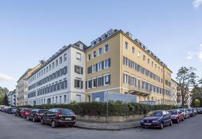 Die in großen Teilen sehr regelmäßige, stereotype Fensterreihung wird im östlichen fünfgeschossigen Flügel durch zwei spitzwinklige viergeschossige Vorbauten und im Westflügel durch einen breit gelagerten Balkon im ersten Obergeschoss unterbrochen und akzentuiert. Ein Baukörperversatz betont die Straßenecke.