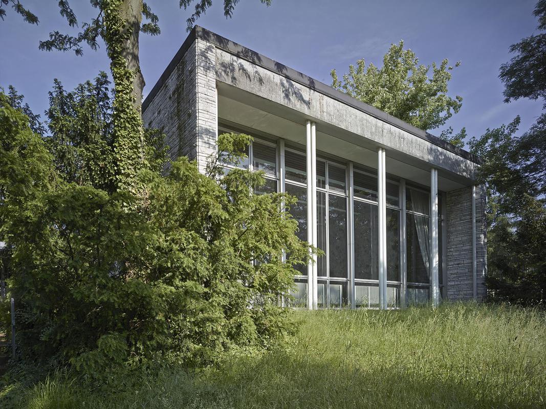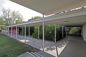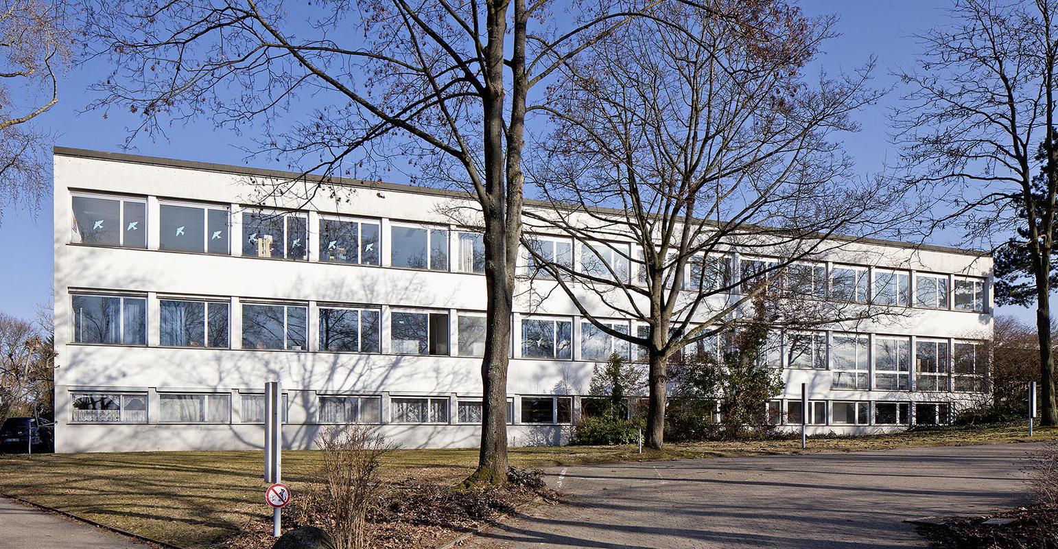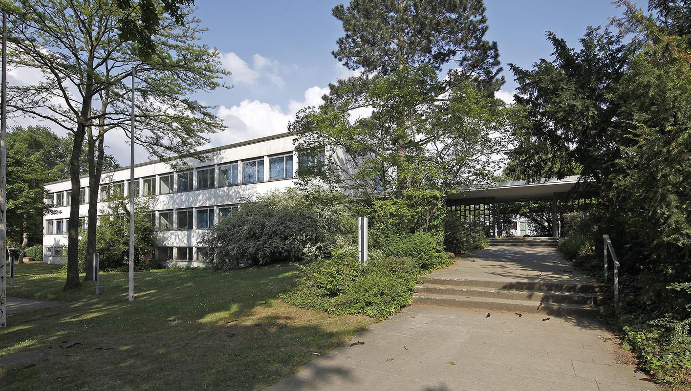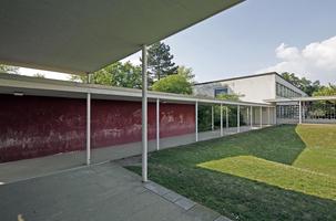 Die Architektur ist schmucklos und von großer Sachlichkeit geprägt, dennoch entsteht durch die Verteilung und Verflechtung der einzelnen Teile ein vielfältiger Gebäudekomplex, der trotz serieller Fassaden keine Monotonie aufkommen lässt. Die Gymnastikhalle ist als Sonderbaukörper in ihrer Form und im Material hervorgehoben: Eine großflächige nach Westen geöffnete Glasfassade hinter einem loggiaartigen Vorbau, der von drei Stahl-Doppelstützen getragen wird, belichtet die Halle. Die Wände der Halle sind anders als die ansonsten weiß verputzten Gebäude mit Natursteinriemchen verkleidet. Die etwa vierzehn auf vierzehn Meter große Halle hat einen Schwingboden mit Linoleum belegt und Wände aus Lochsteinen, die den Schall dämpfen. Im Foyer des Schulgebäudes führt eine weit geschwungene Treppe in das Obergeschoss, ein typisches architektonisches Element der Nachkriegsarchitektur zur Betonung besonderer Räume.