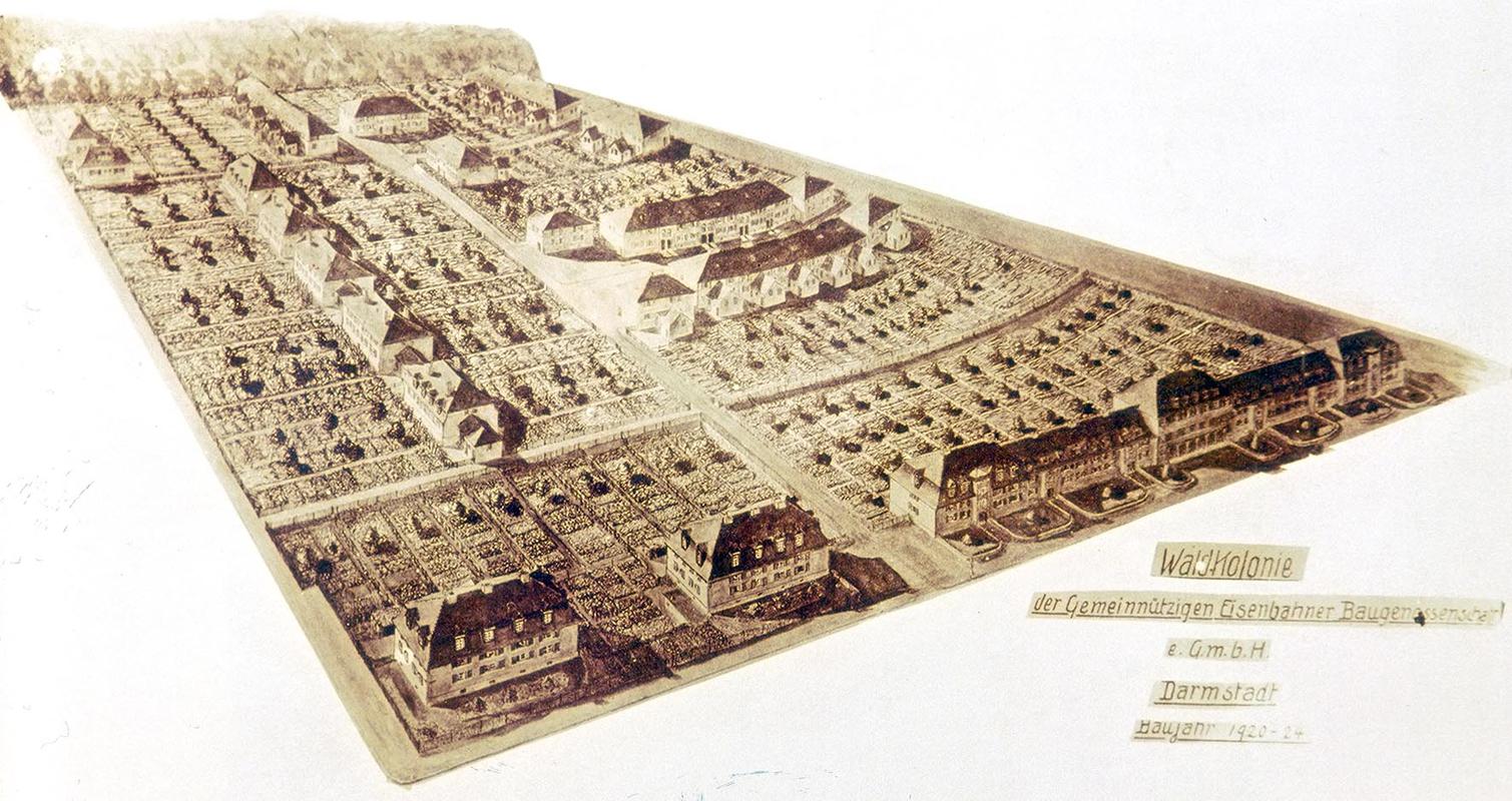 Zu diesem Zweck wurde die „Gemeinnützige Heimstätten-Baugesellschaft m.b.H.“ gegründet, die im März 1919 einen städtebaulichen Wettbewerb „unter den in Darmstadt dauernd ansässigen Architekten zur Erlangung von Entwürfen für die Anlage einer Heimstätten-Siedlung von 50 Wohnhäusern“ (Darmstädter Tagblatt 28.3.1919) auslobte. Von den 33 eingereichten Entwürfen wählte das Preisgericht (Karl Hofmann, Friedrich Pützer, Arthur Wienkoop, Leonhard Schäfer und August Buxbaum) den Entwurf mit dem Kennwort „Ganze Arbeit“ der Architekten Heinrich Stumpf und Karl Osterrath aus. Beide waren Lehrer an der Baugewerkschule, der späteren Fachhochschule.