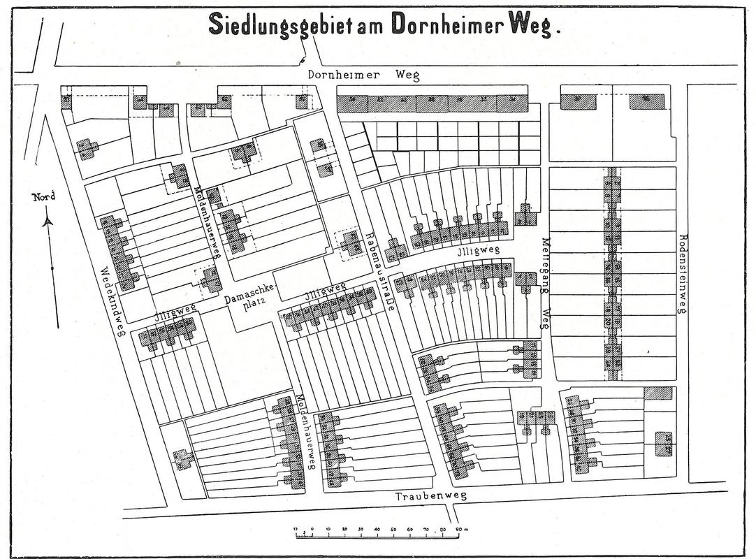 Bis 1925 wurde das Gebiet mit Einfamilienreihenhäusern, ähnlich denen der Heimstätten-Baugesellschaft, unter Eigenbeteiligung der Bewohner bebaut. Außerdem entstand eine Gruppe zweieinhalbgeschossiger Mehrfamilienhäuser entlang des Dornheimer Wegs, die als Besonderheit keine langgestreckten Gärten hatten, sondern eine parzellierte Gartenanlage südlich vor dem Gebäude, erreichbar über einen verbindenden Querweg.